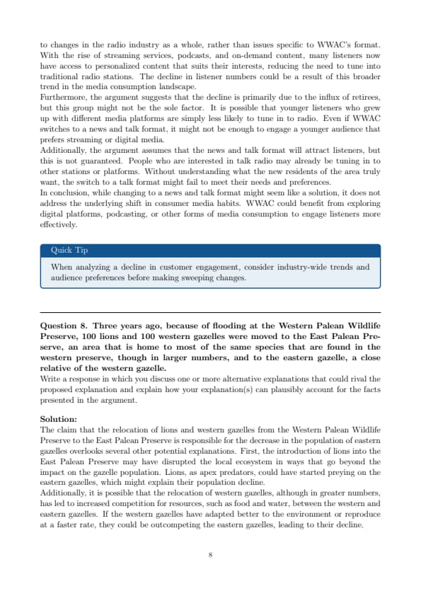 “To reverse a decline in listener numbers, our owners have decided that WWAC must change from its current rock-music format. The decline has occurred despite population growth in our listening area, but that growth has resulted mainly from people moving here after their retirement. We must make listeners of these new residents. We could try playing music tailored to their tastes, but a continuing decline in local sales of recorded music suggests limited interest in music. Instead, we should change to a news and talk format, a form of radio that is increasingly popular in our area.”