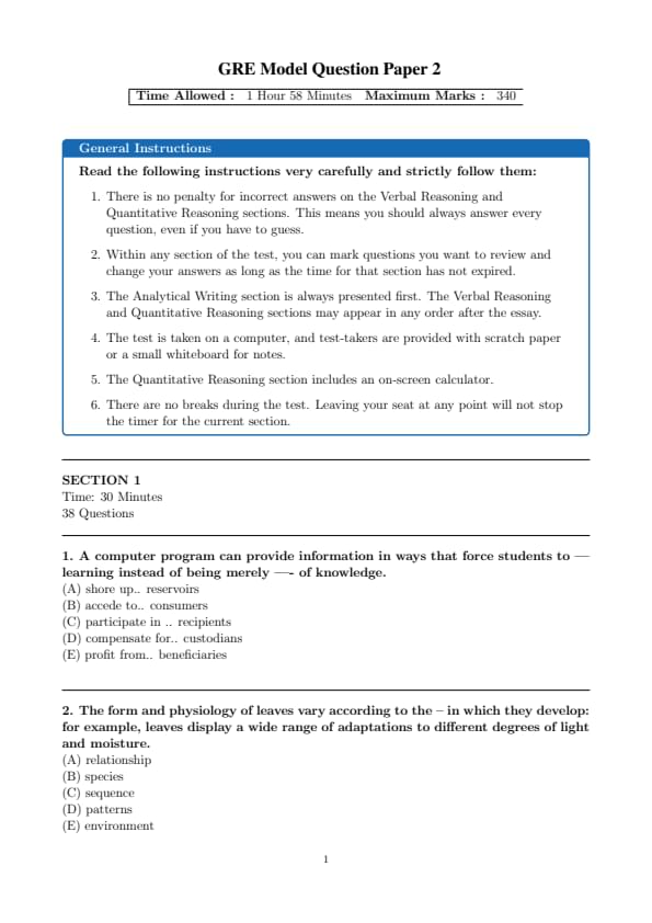 GRE 2025 Model Paper Set 2 Question Paper with Solutions PDF is available for download. The overall test time is about 1 hour and 58 minutes. GRE has total 5 sections: