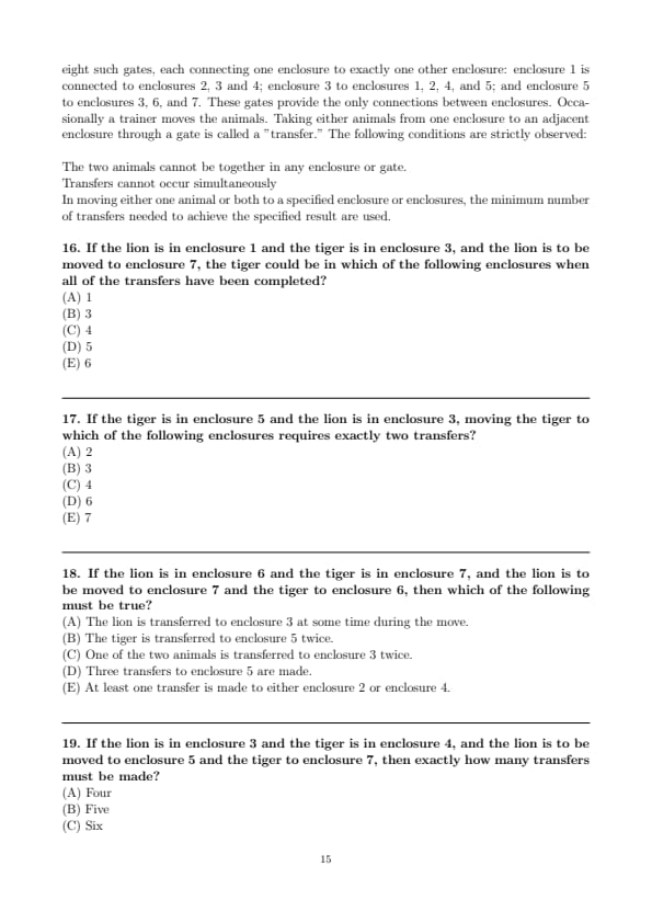 If the lion is in enclosure 1 and the tiger is in enclosure 3, and the lion is to be moved to enclosure 7, the tiger could be in which of the following enclosures when all of the transfers have been completed?