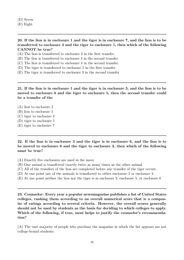 If the lion is in enclosure 1 and the tiger is in enclosure 7, and the lion is to be transferred to enclosure 3 and the tiger to enclosure 1, then which of the following CANNOT be true?