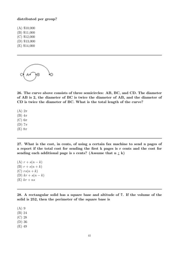 The curve above consists of three semicircles: AB, BC, and CD. The diameter of AB is 2, the diameter of BC is twice the diameter of AB, and the diameter of CD is twice the diameter of BC. What is the total length of the curve?