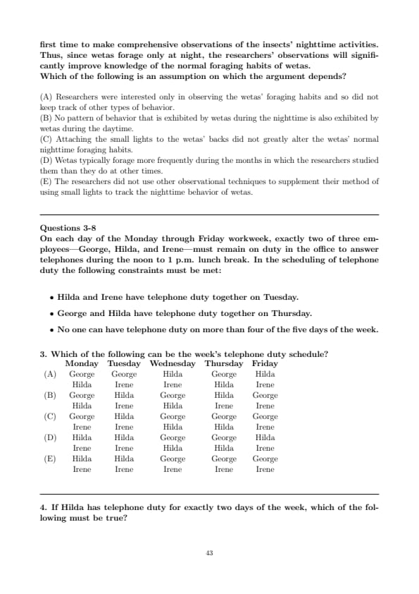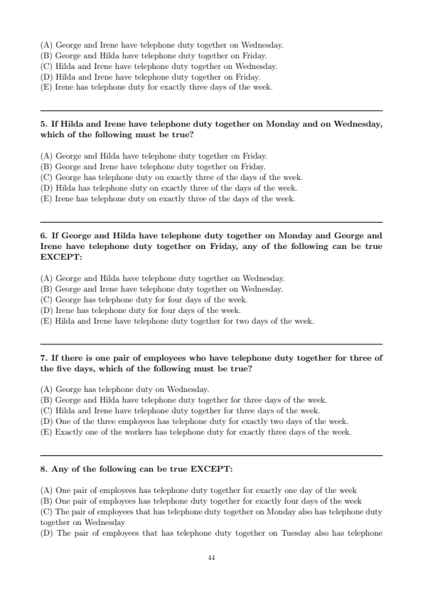 If George and Hilda have telephone duty together on Monday and George and Irene have telephone duty together on Friday, any of the following can be true EXCEPT: