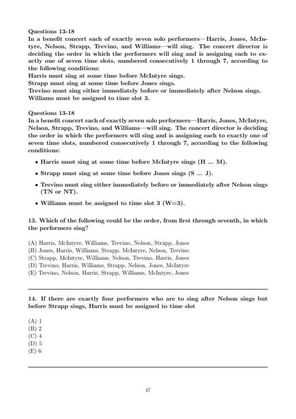 Which of the following could be the order, from first through seventh, in which the performers sing?