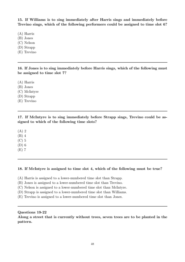 If McIntyre is to sing immediately before Strapp sings, Trevino could be assigned to which of the following time slots?