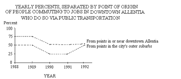 Which of the following, if true about early 1990, would most help to explain the decrease, in 1990, of the percent of people commuting to jobs in downtown Allentia who do so via public transportation?