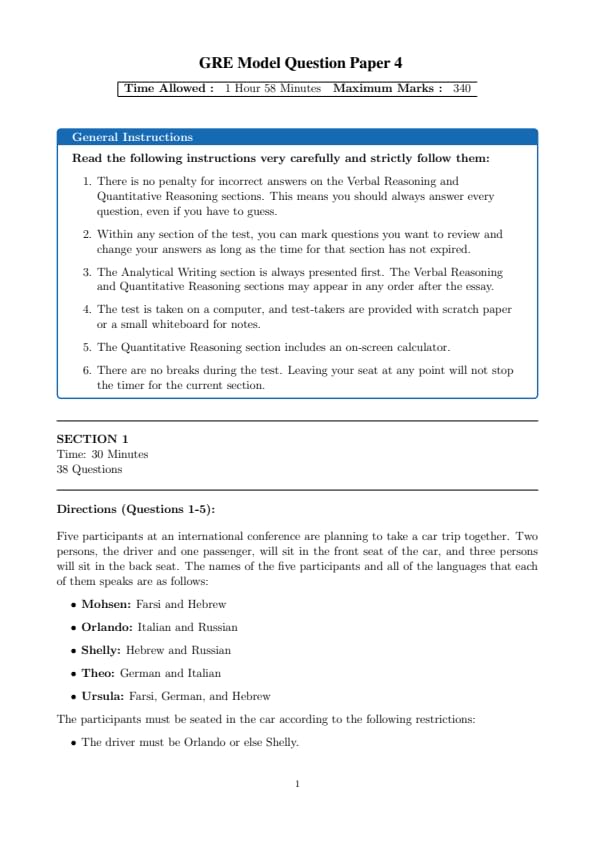 GRE 2025 Model Paper Set 4 Question Paper with Solutions PDF is available for download. The overall test time is about 1 hour and 58 minutes. GRE has total 5 sections: