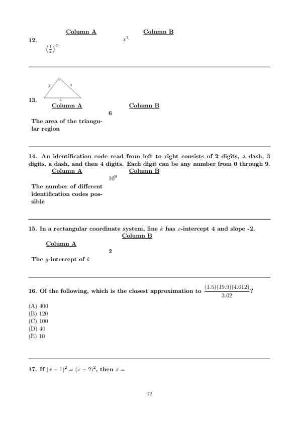 - Quantitative Reasoning (Two Sections, with 12 questions and 15 questions respectively)