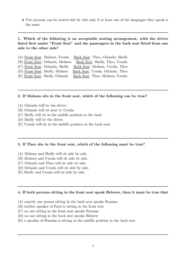 Which of the following is an acceptable seating arrangement, with the driver listed first under "Front Seat" and the passengers in the back seat listed from one side to the other side?