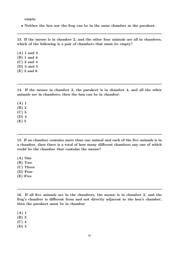 If the mouse is in chamber 2, and the other four animals are all in chambers, which of the following is a pair of chambers that must be empty?