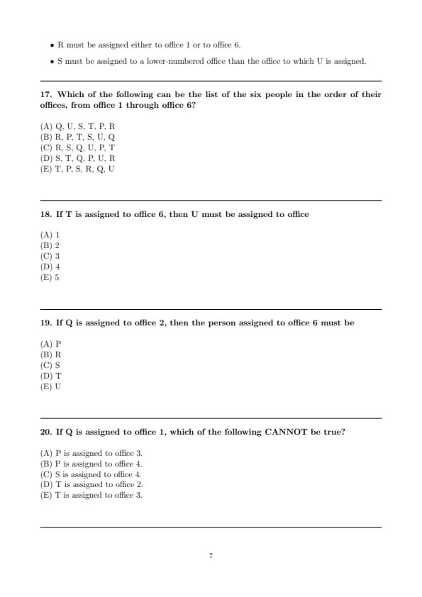 If Q is assigned to office 1, which of the following CANNOT be true?