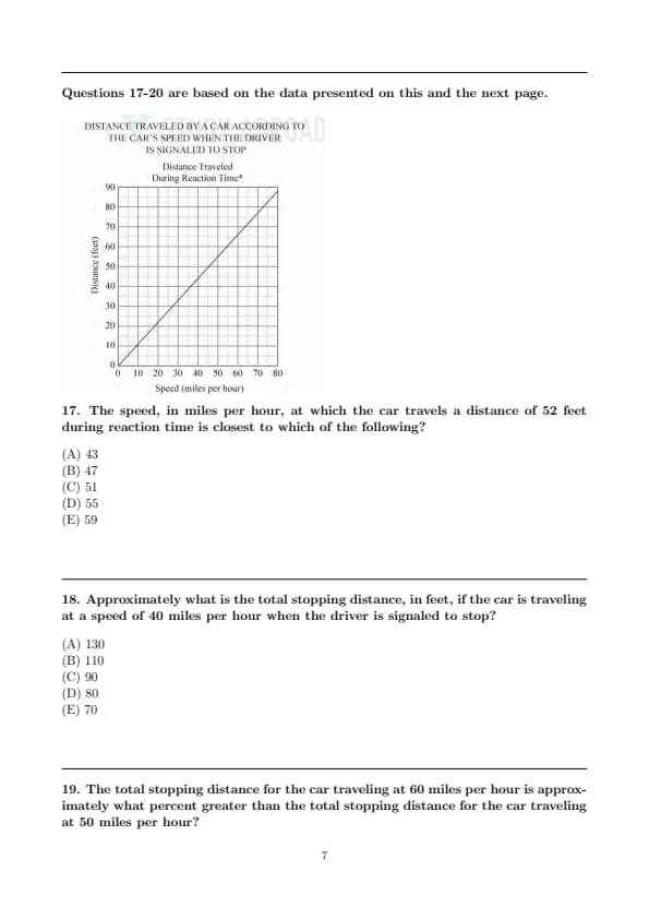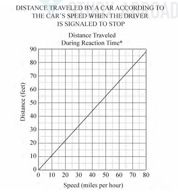 The speed, in miles per hour, at which the car travels a distance of 52 feet during reaction time is closest to which of the following?