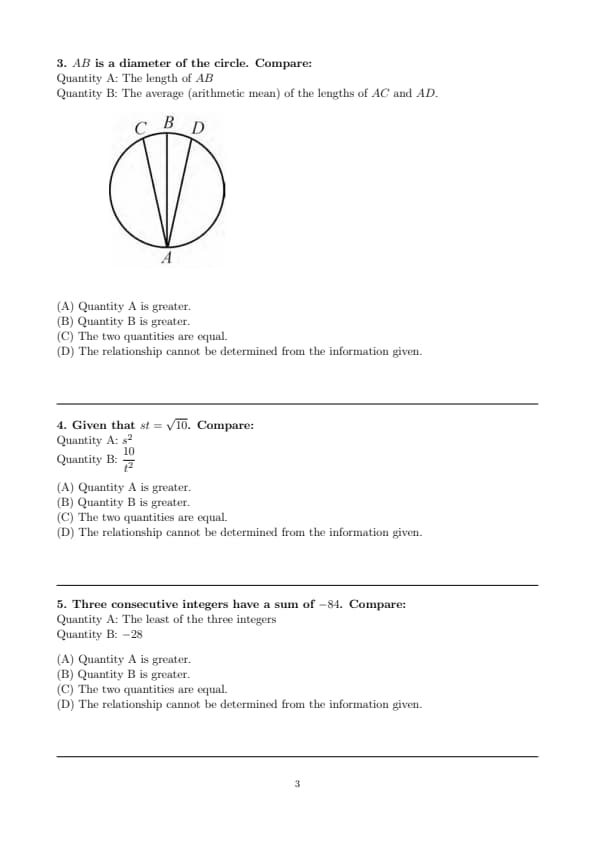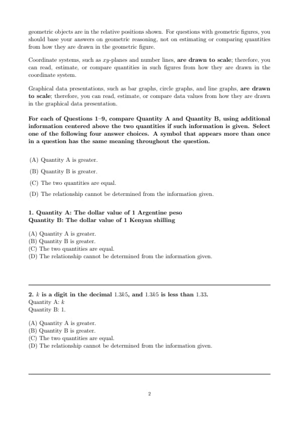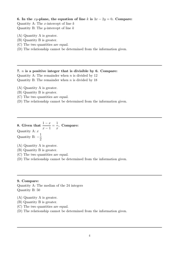 For each of Questions 1--9, compare Quantity A and Quantity B, using additional information centered above the two quantities if such information is given. Select one of the following four answer choices. A symbol that appears more than once in a question has the same meaning throughout the question.