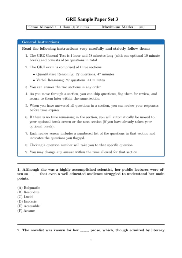 GRE 2025 Sample Paper Set 3 Question Paper with Solutions PDF is available for download. The overall test time is about 1 hour and 58 minutes. GRE has total 5 sections: