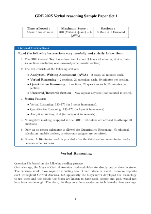 GRE 2025 Verbal Reasoning Sample Paper Set 1 Question Paper with Solutions PDF is available for download. The overall test time is about 1 hour and 58 minutes. GRE has total 5 sections: