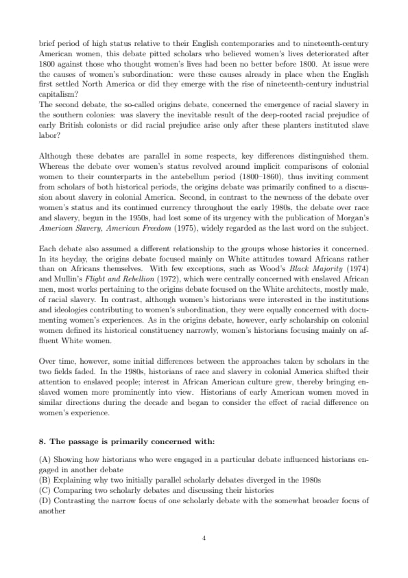 Each debate also assumed a different relationship to the groups whose histories it concerned. In its heyday, the origins debate focused mainly on White attitudes toward Africans rather than on Africans themselves. With few exceptions, such as Wood’s \textit{Black Majority} (1974) and Mullin’s Flight and Rebellion (1972), which were centrally concerned with enslaved African men, most works pertaining to the origins debate focused on the White architects, mostly male, of racial slavery. In contrast, although women’s historians were interested in the institutions and ideologies contributing to women’s subordination, they were equally concerned with documenting women’s experiences. As in the origins debate, however, early scholarship on colonial women defined its historical constituency narrowly, women’s historians focusing mainly on affluent White women.\\
