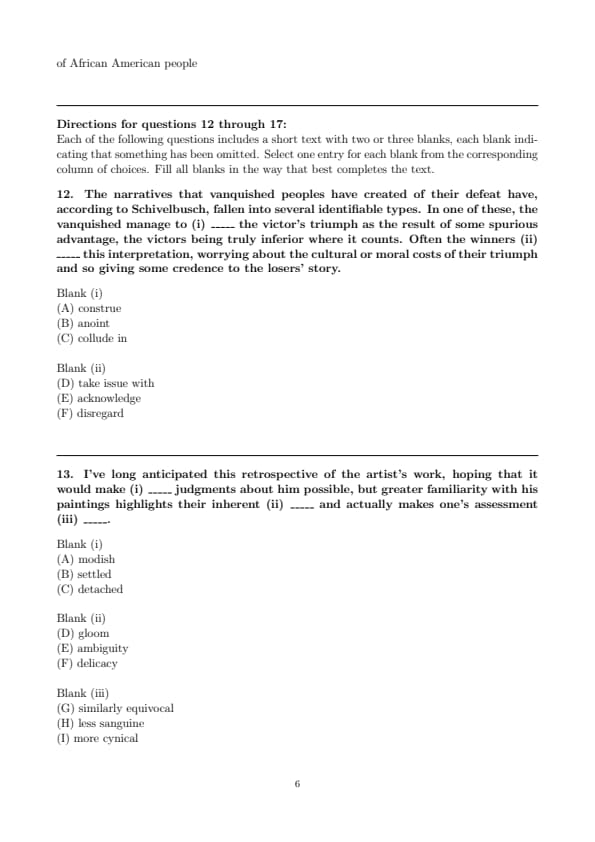 The narratives that vanquished peoples have created of their defeat have, according to Schivelbusch, fallen into several identifiable types. In one of these, the vanquished manage to (i) _____ the victor’s triumph as the result of some spurious advantage, the victors being truly inferior where it counts. Often the winners (ii) _____ this interpretation, worrying about the cultural or moral costs of their triumph and so giving some credence to the losers’ story.