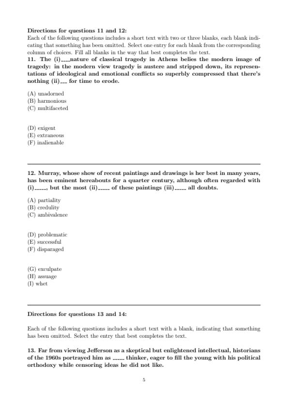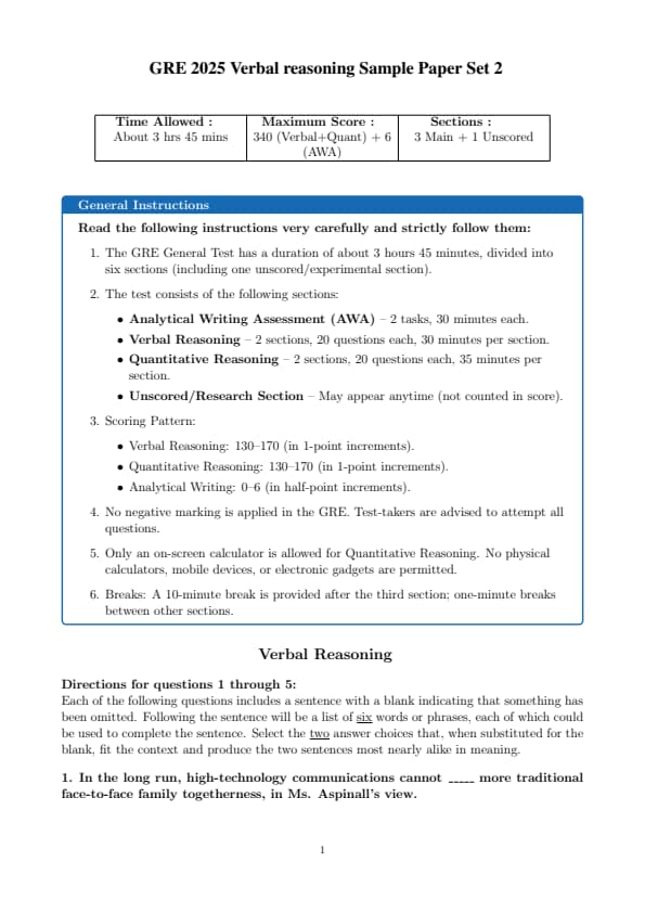 GRE 2025 Verbal Reasoning Sample Paper Set 2 Question Paper with Solutions PDF is available for download. GRE has total 5 sections: