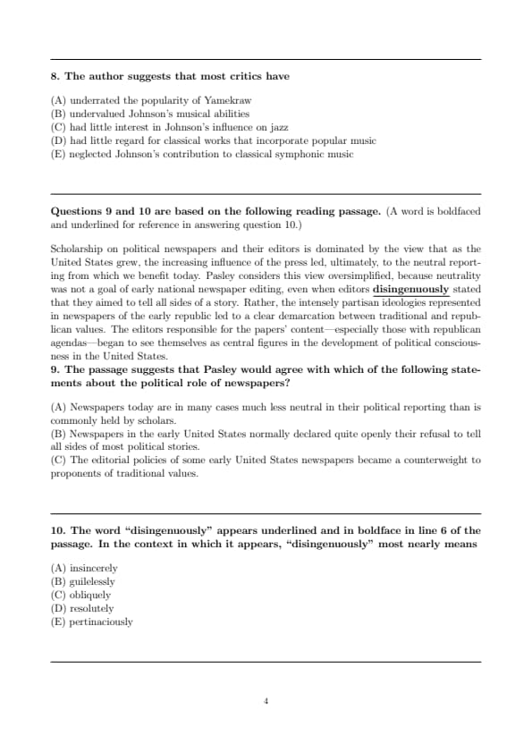 The word “disingenuously” appears underlined and in boldface in line 6 of the passage. In the context in which it appears, “disingenuously” most nearly means