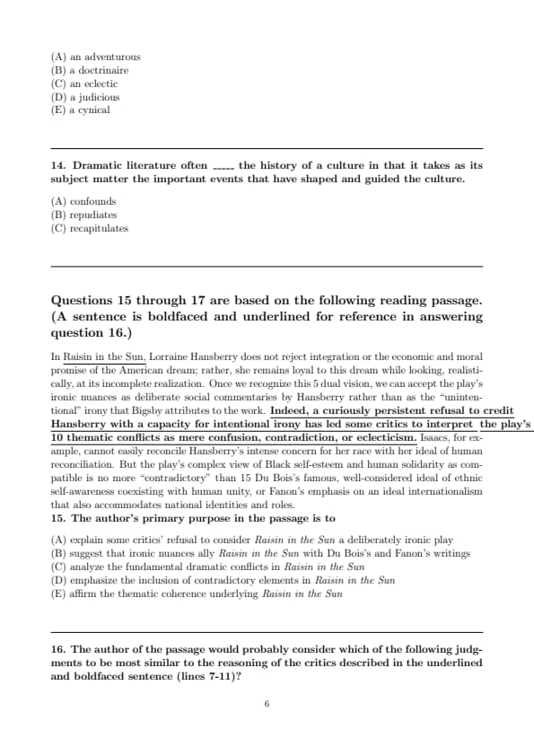 In Raisin in the Sun, Lorraine Hansberry does not reject integration or the economic and moral promise of the American dream; rather, she remains loyal to this dream while looking, realistically, at its incomplete realization. Once we recognize this 5 dual vision, we can accept the play’s ironic nuances as deliberate social commentaries by Hansberry rather than as the “unintentional” irony that Bigsby attributes to the work. Indeed, a curiously persistent refusal to credit Hansberry with a capacity for intentional irony has led some critics to interpret the play’s \underline{\textbf{10 thematic conflicts as mere confusion, contradiction, or eclecticism. Isaacs, for example, cannot easily reconcile Hansberry’s intense concern for her race with her ideal of human