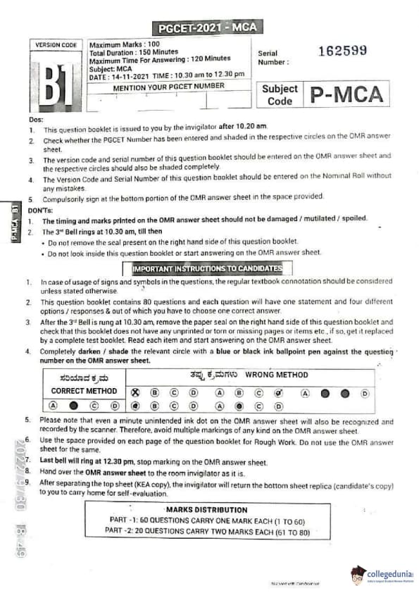 Karnataka PGCET 2021 MCA Question paper with answer key pdf conducted on November 14, 2021 in Forenoon Session 10:30 AM to 12:30 PM is available for download. The exam was successfully organized by Karnataka Examinations Authority (KEA). The question paper comprised a total of 80 questions divided among 2 sections.