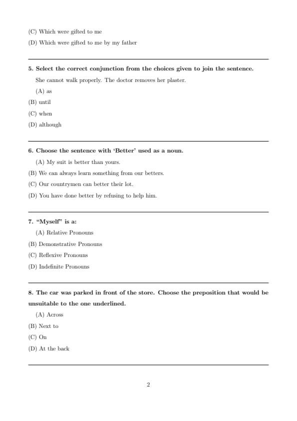 Step 4: Therefore, the sentence where better is used as a noun is option (B). Quick Tip: Some adjectives like \textbf{better} can function as nouns when they refer to a group of people, e.g., \textbf{the rich, the poor, our betters}.