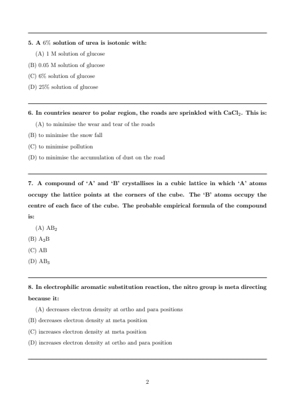 Hence, a \(6%\) solution of urea is isotonic with a \(\boxed{1\ M}\) solution of glucose. Quick Tip: For isotonic solutions of non-electrolytes, equality of molarity is sufficient since their van’t Hoff factor \(i = 1\).