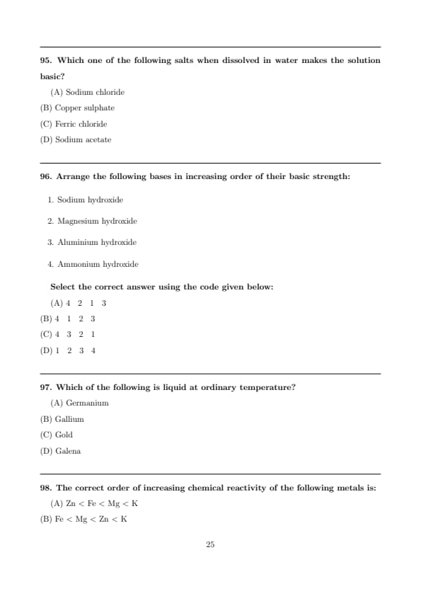 The correct option is \(\boxed{(C)}\). Quick Tip: Group-1 metal hydroxides are the strongest bases. Amphoteric hydroxides like \(Al(OH)_3\) show very weak basic nature.