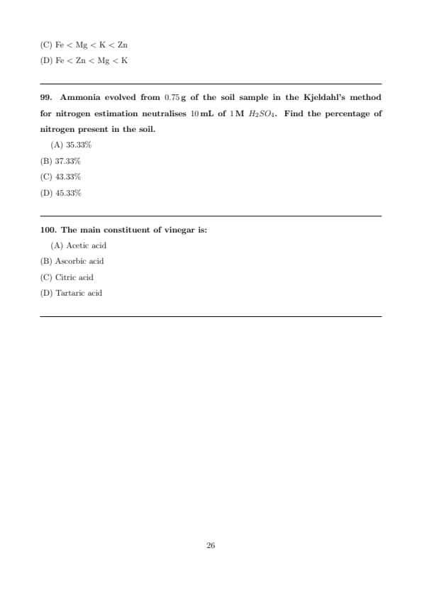 Ammonia evolved from \(0.75\,g\) of the soil sample in the Kjeldahl’s method for nitrogen estimation neutralises \(10\,mL\) of \(1\,M\) \(H_2SO_4\). Find the percentage of nitrogen present in the soil.