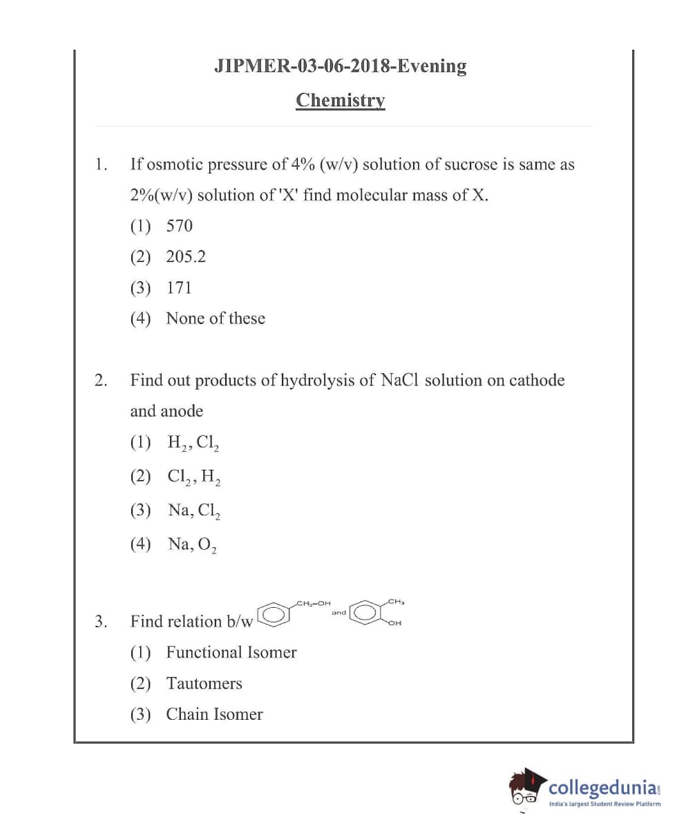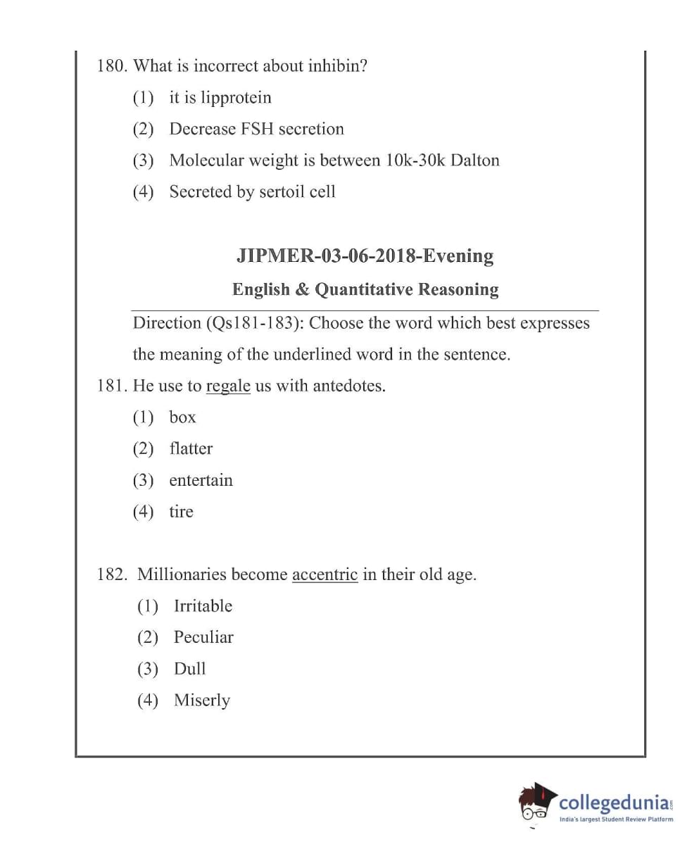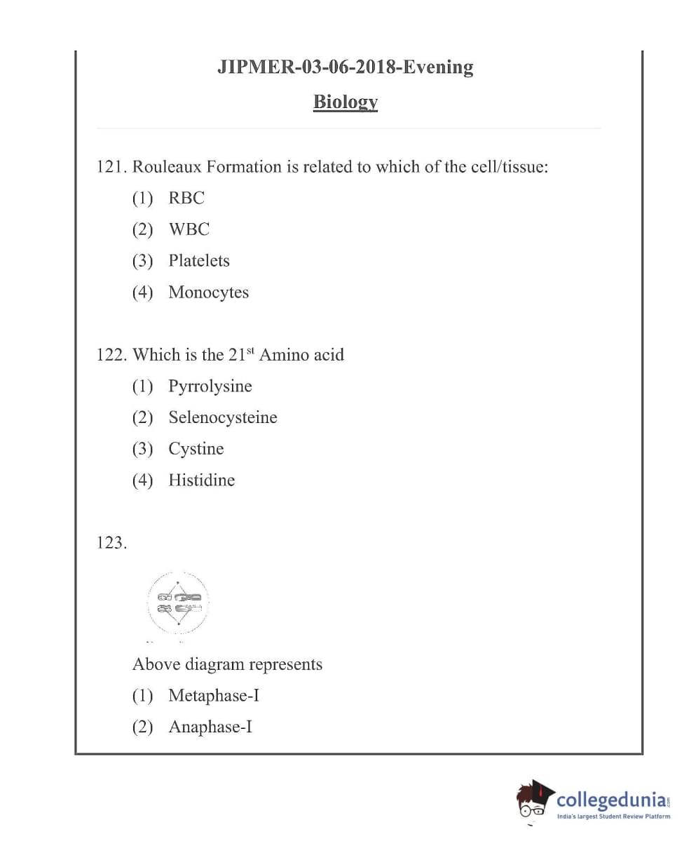 JIPMER 2018 Question Paper with Answer Key PDF in English ,Evening Shift