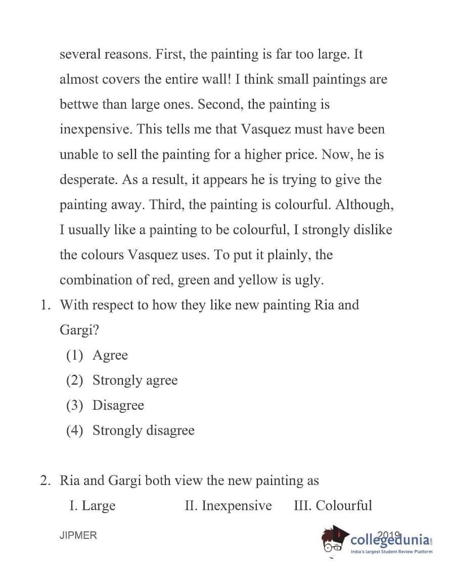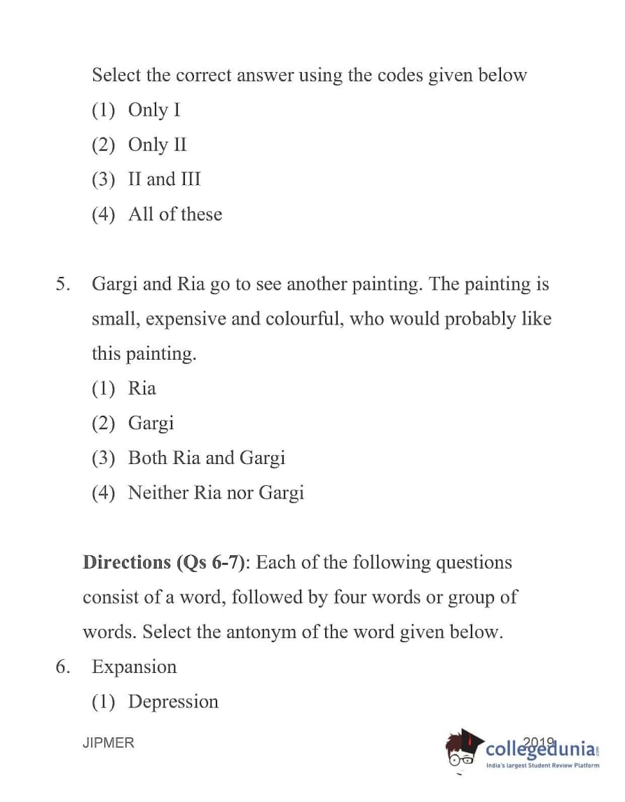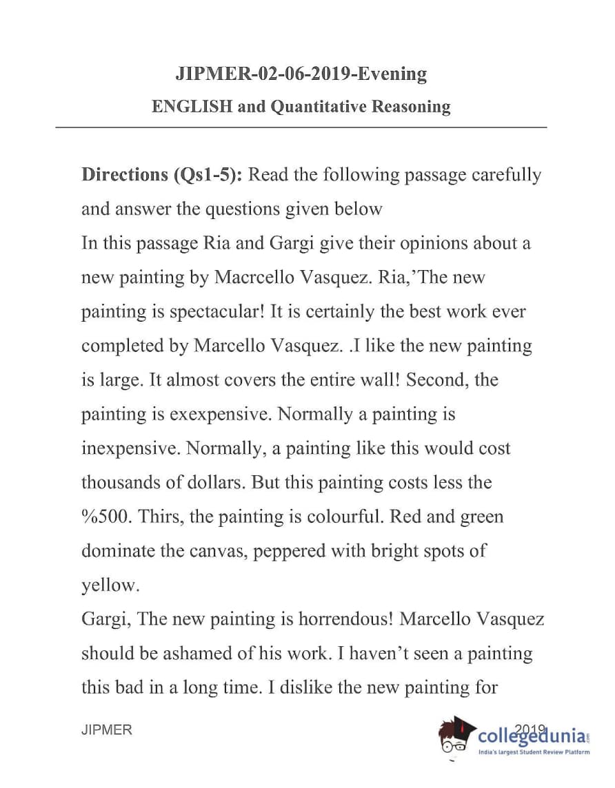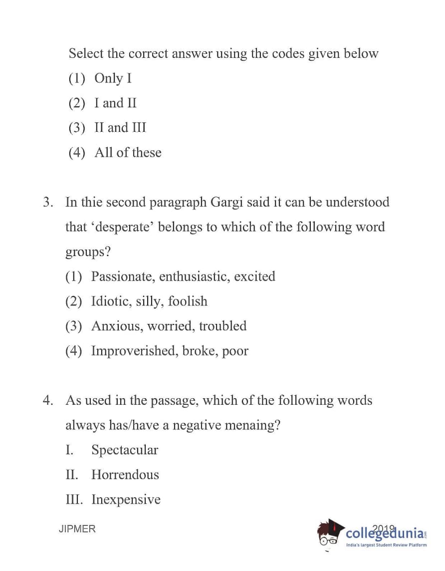 JIPMER 2019 English and Quant Question Paper with Answer Key PDF in English ,Evening Shift