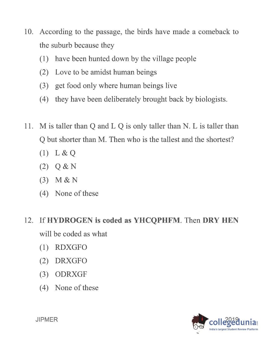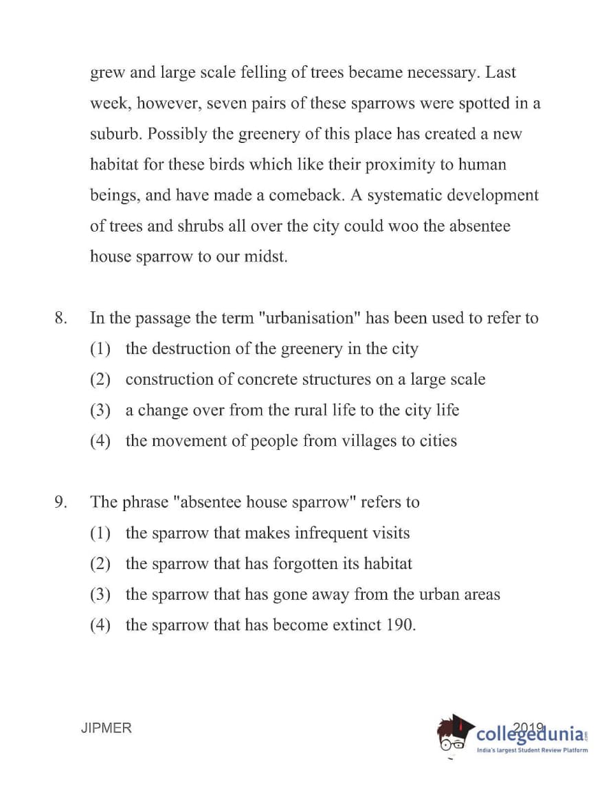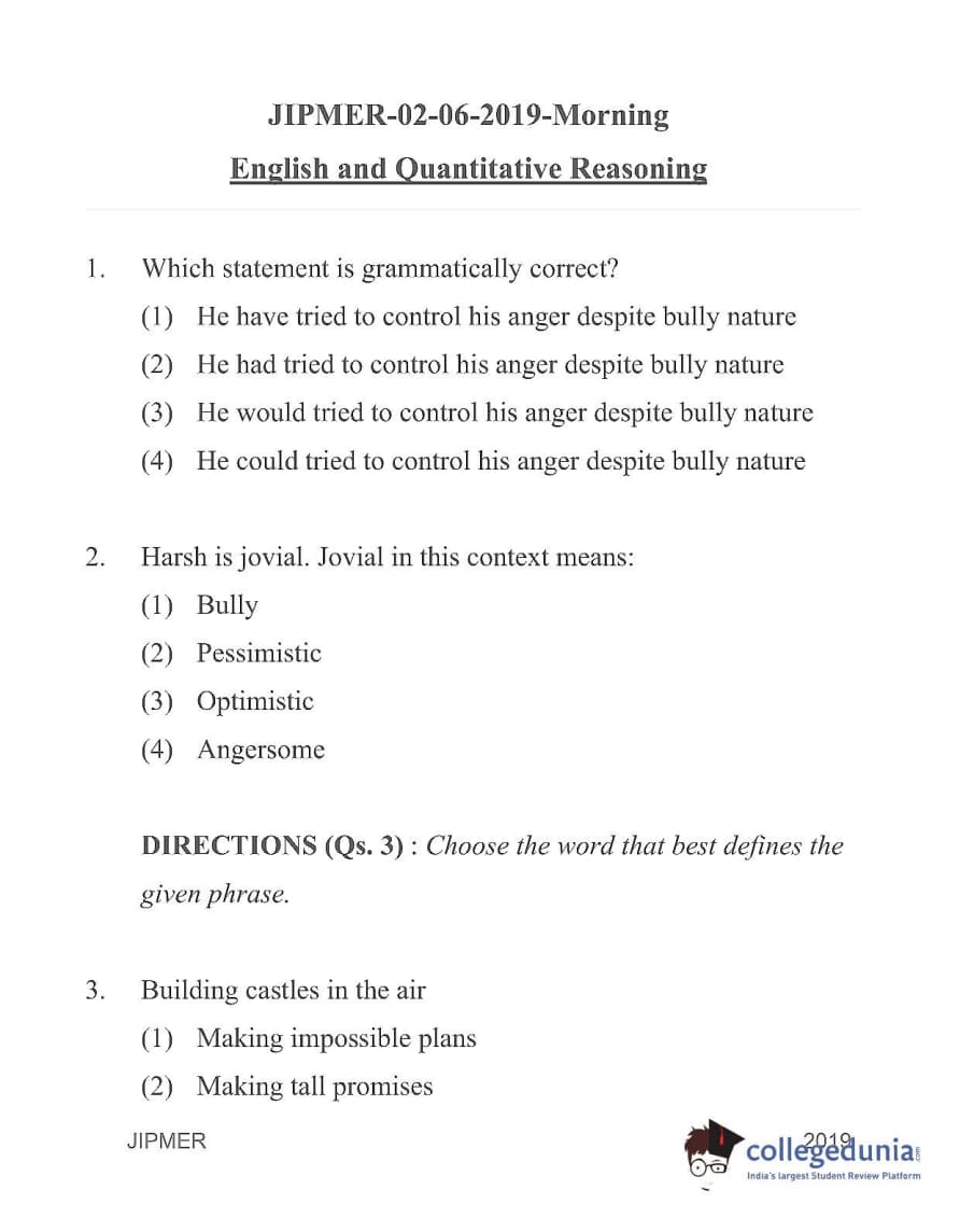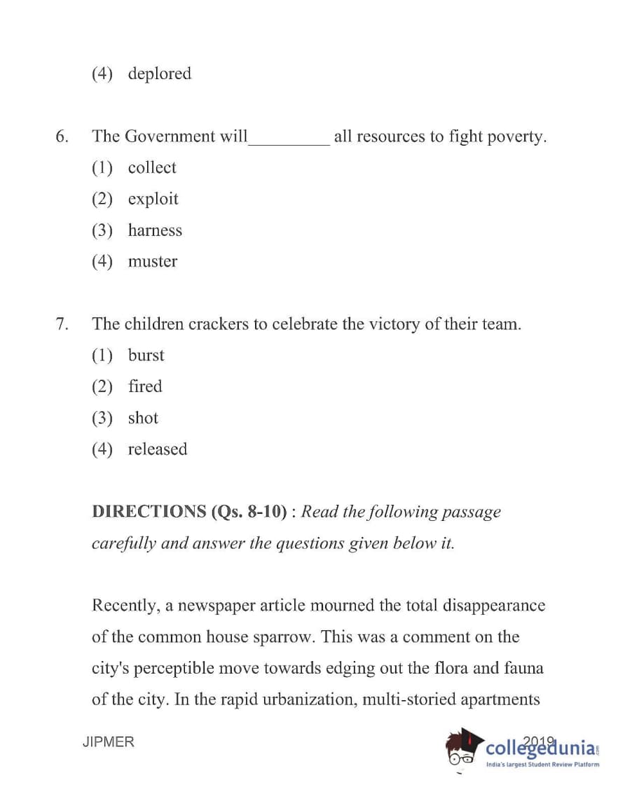 JIPMER 2019 English and Quant Question Paper with Answer Key PDF in English ,Morning Shift