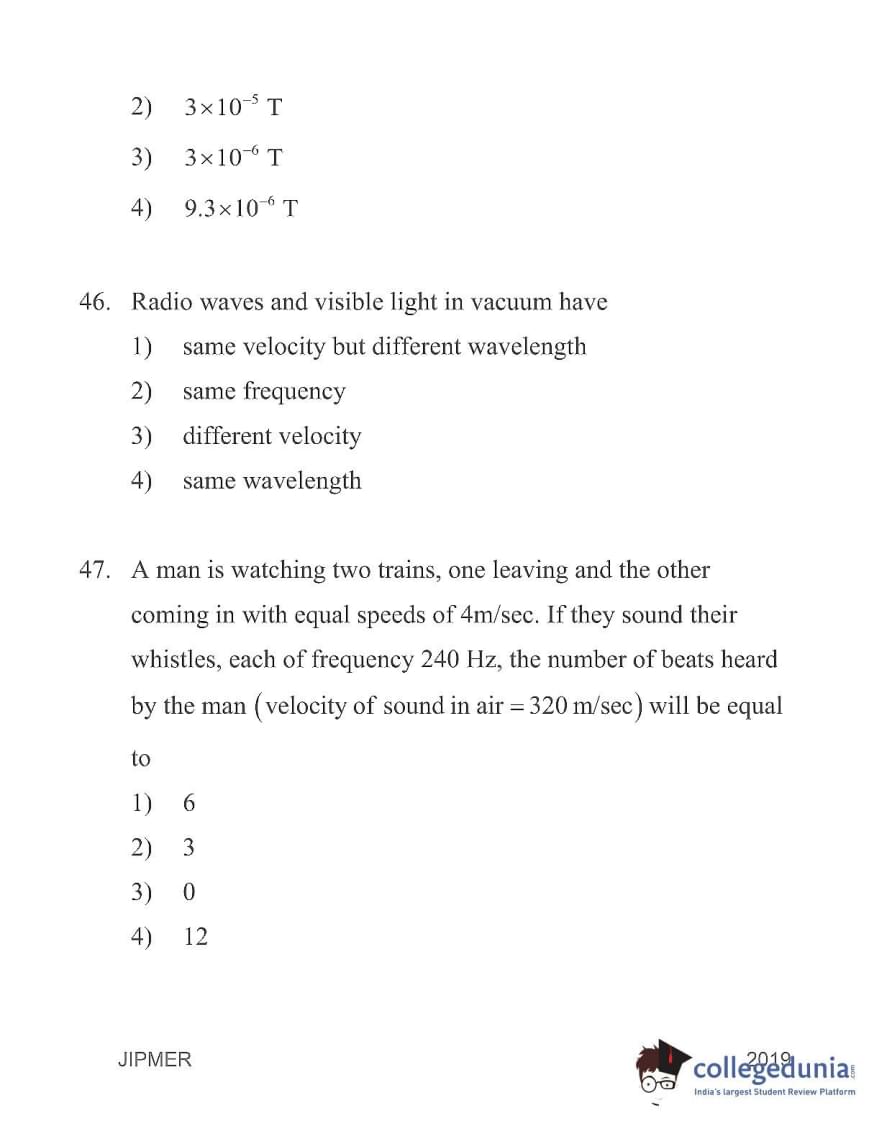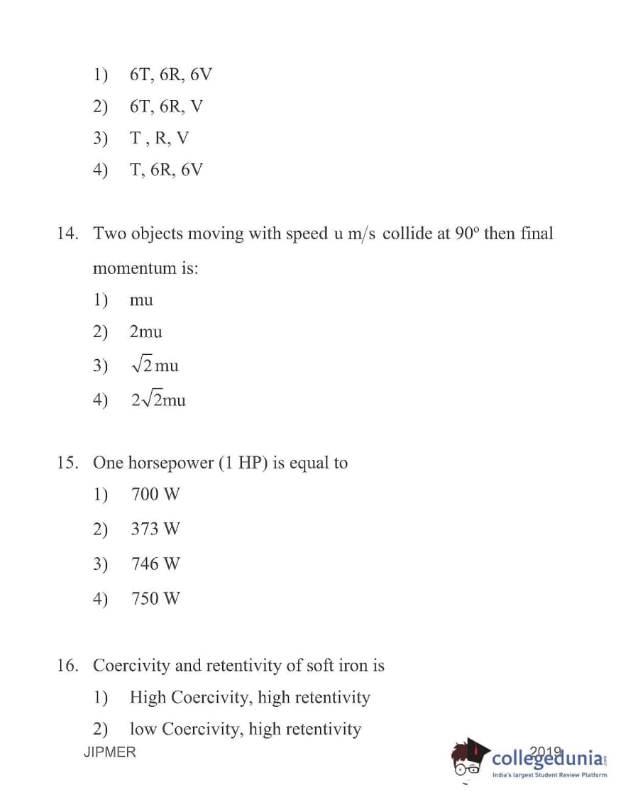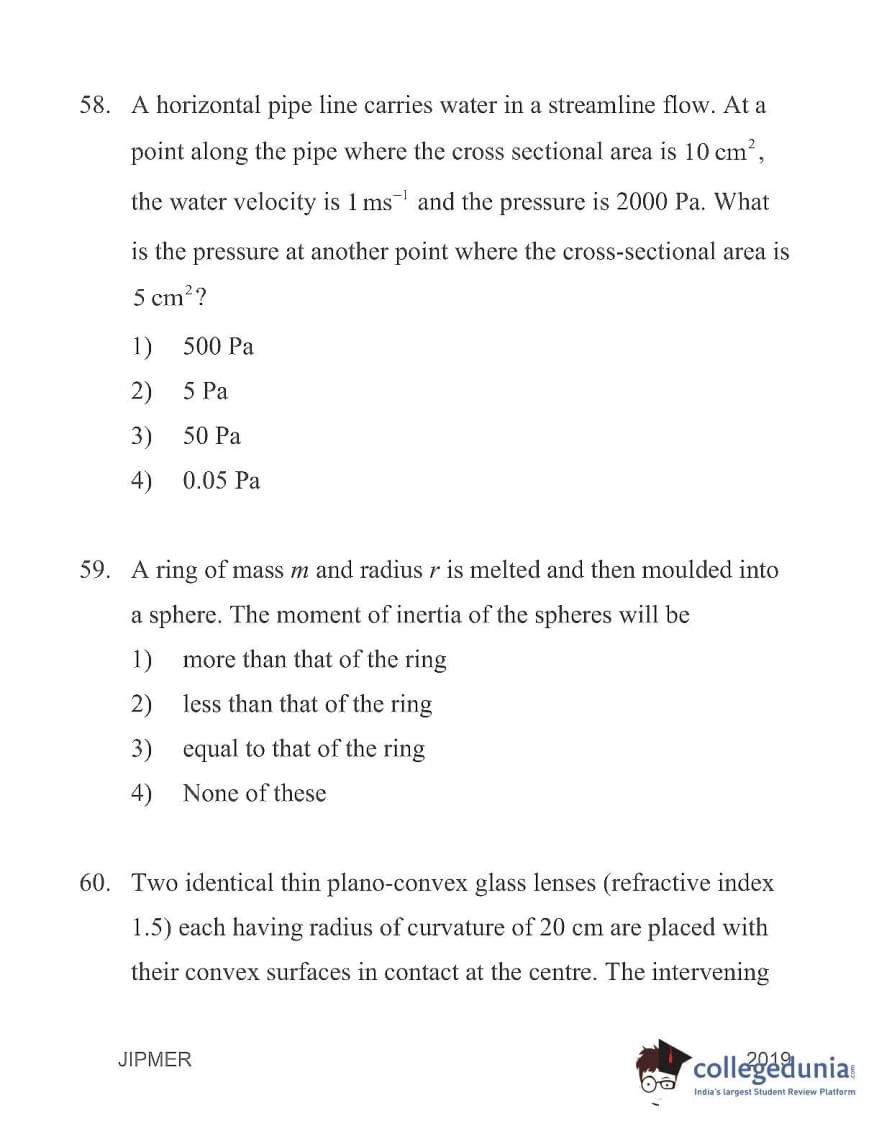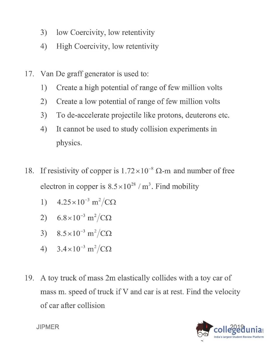 JIPMER 2019 Physics Question paper with answer key pdf conducted on June 2, 2019 in Morning Shift is available for download. The exam was successfully organized by Jawaharlal Institute of Postgraduate Medical Education and Research (JIPMER). The question paper comprised a total of 60.0 questions.