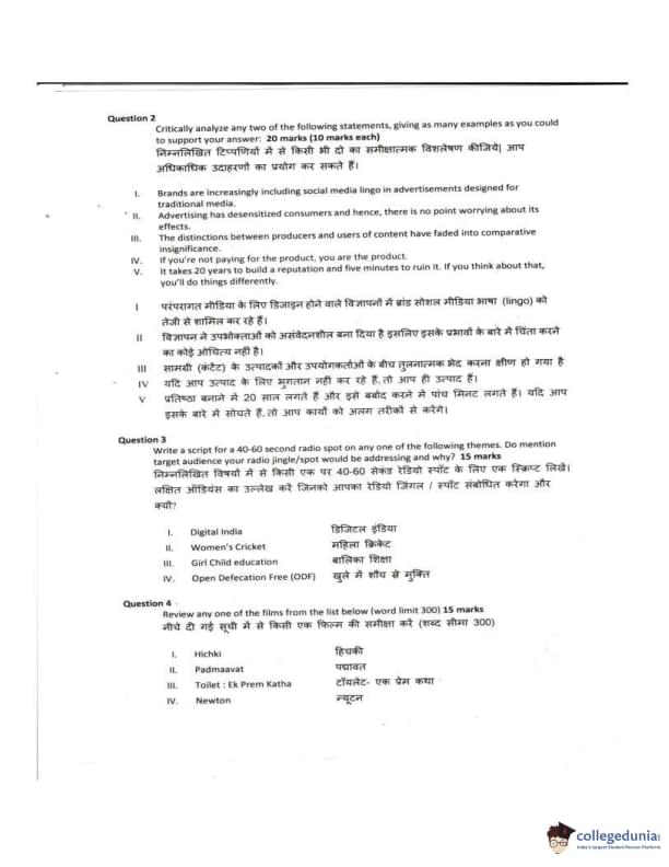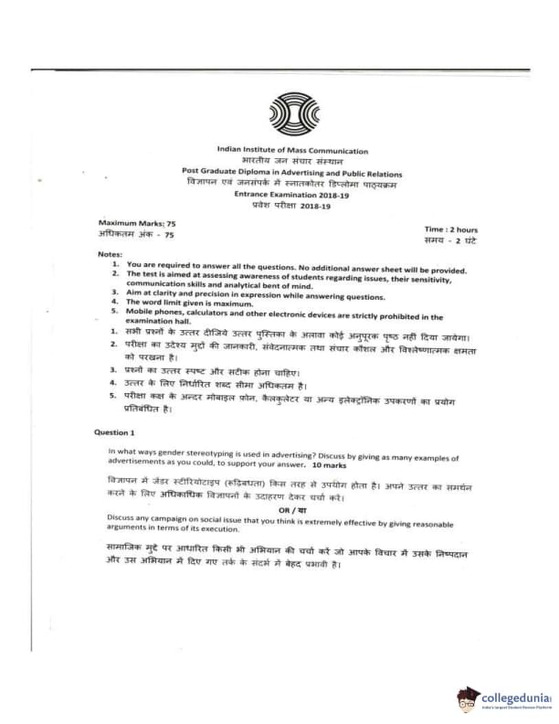 IIMC 2018 Advertising & Relations Question paper with answer key pdf conducted on May 27, 2018 is available for download. The exam was successfully organized by Indian Institute of Mass Communication. The question paper comprised a total of 5 questions.