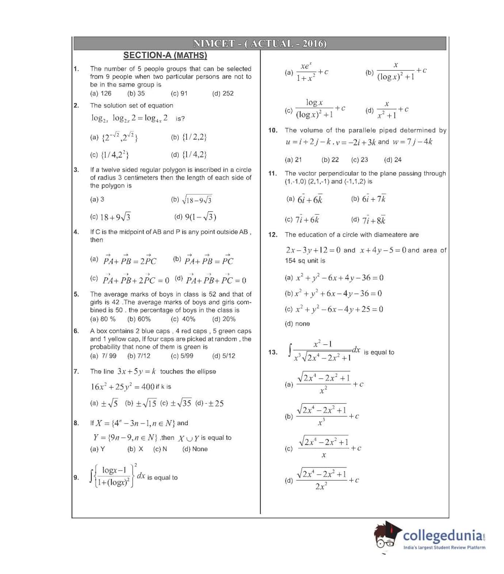 NIMCET 2016 Question Paper with Answer Key PDFs Forenoon Session