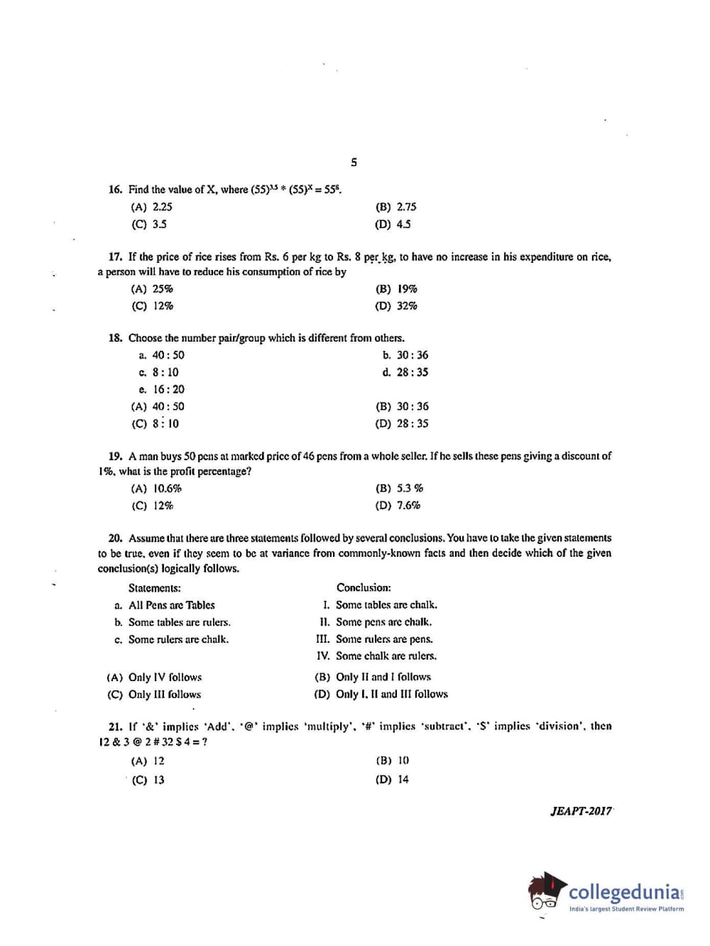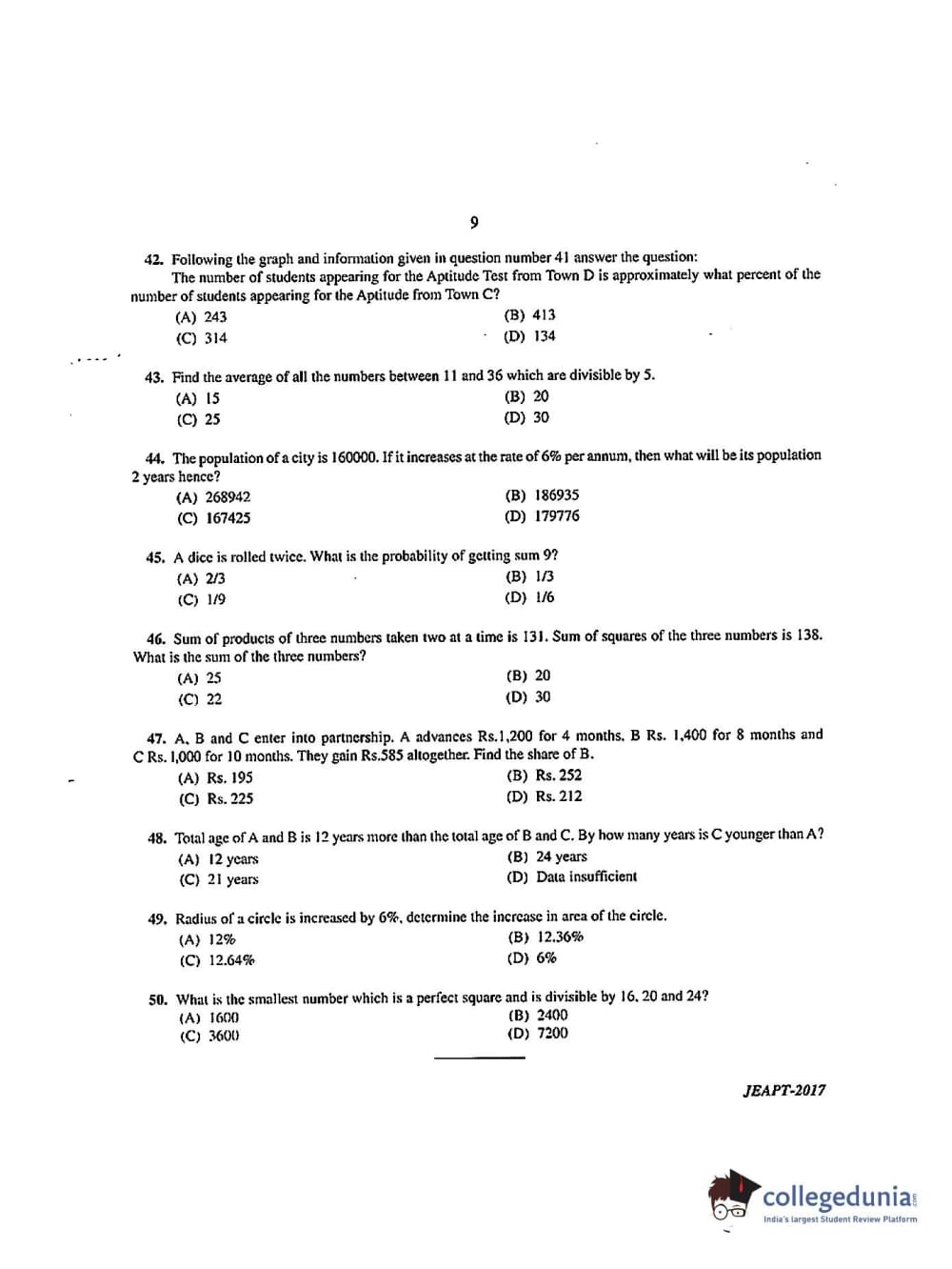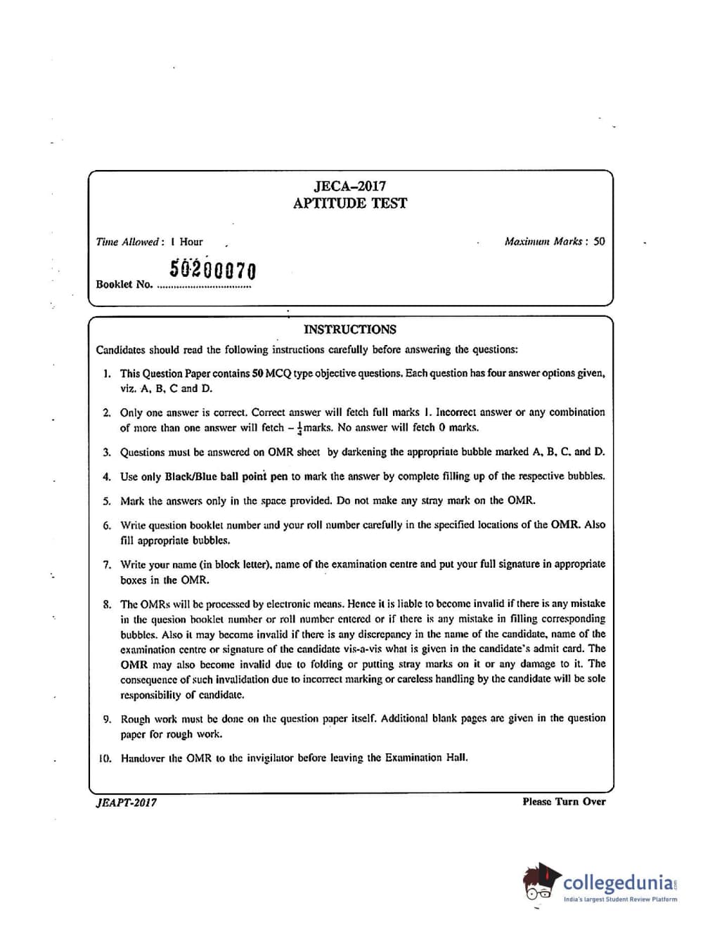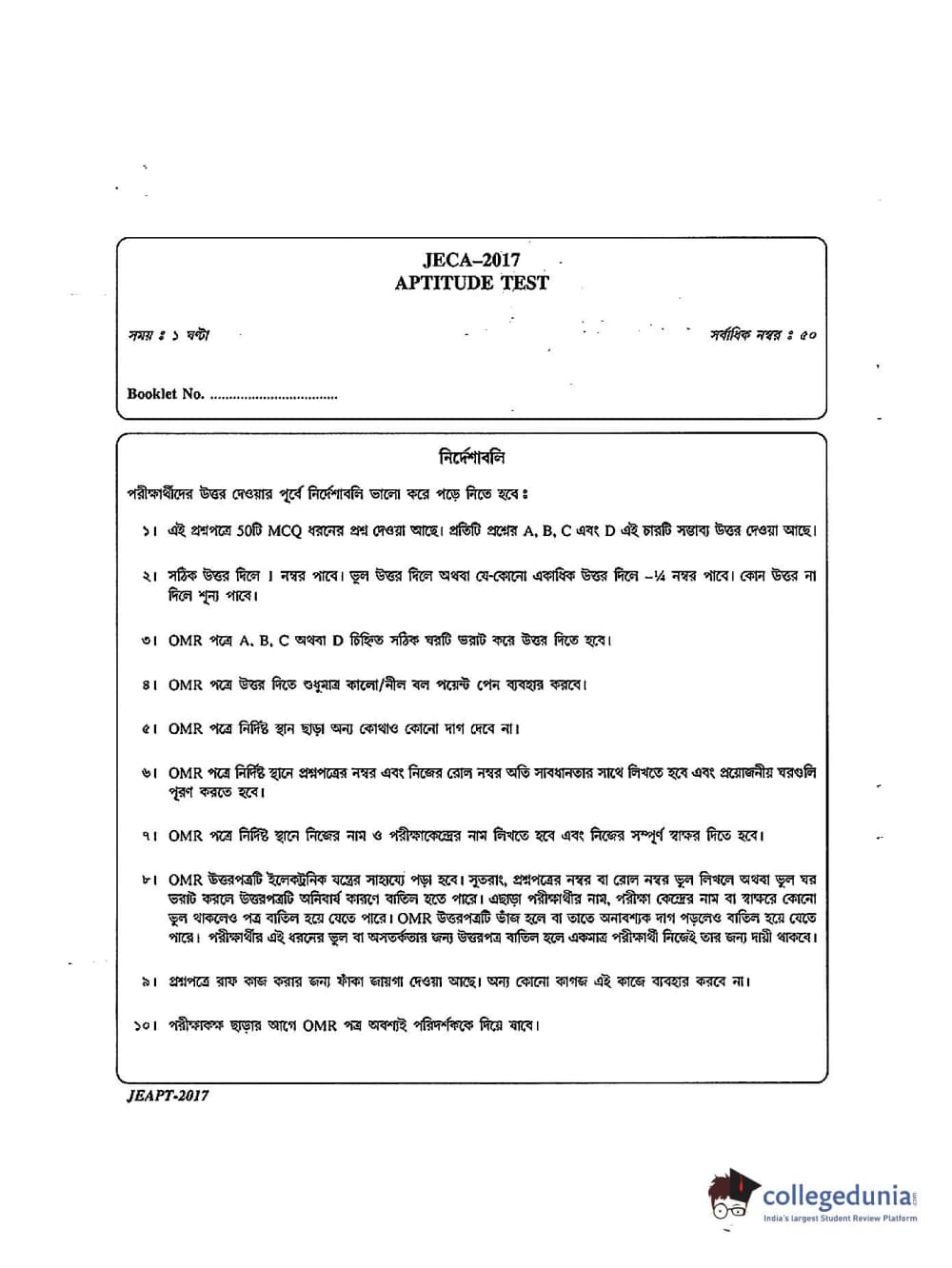 WB JECA 2017 Aptitude Question paper with answer key pdf conducted on June 10, 2017 is available for download. The exam was successfully organized by The West Bengal Joint Entrance Examination Board. The question paper comprised a total of 50 questions.