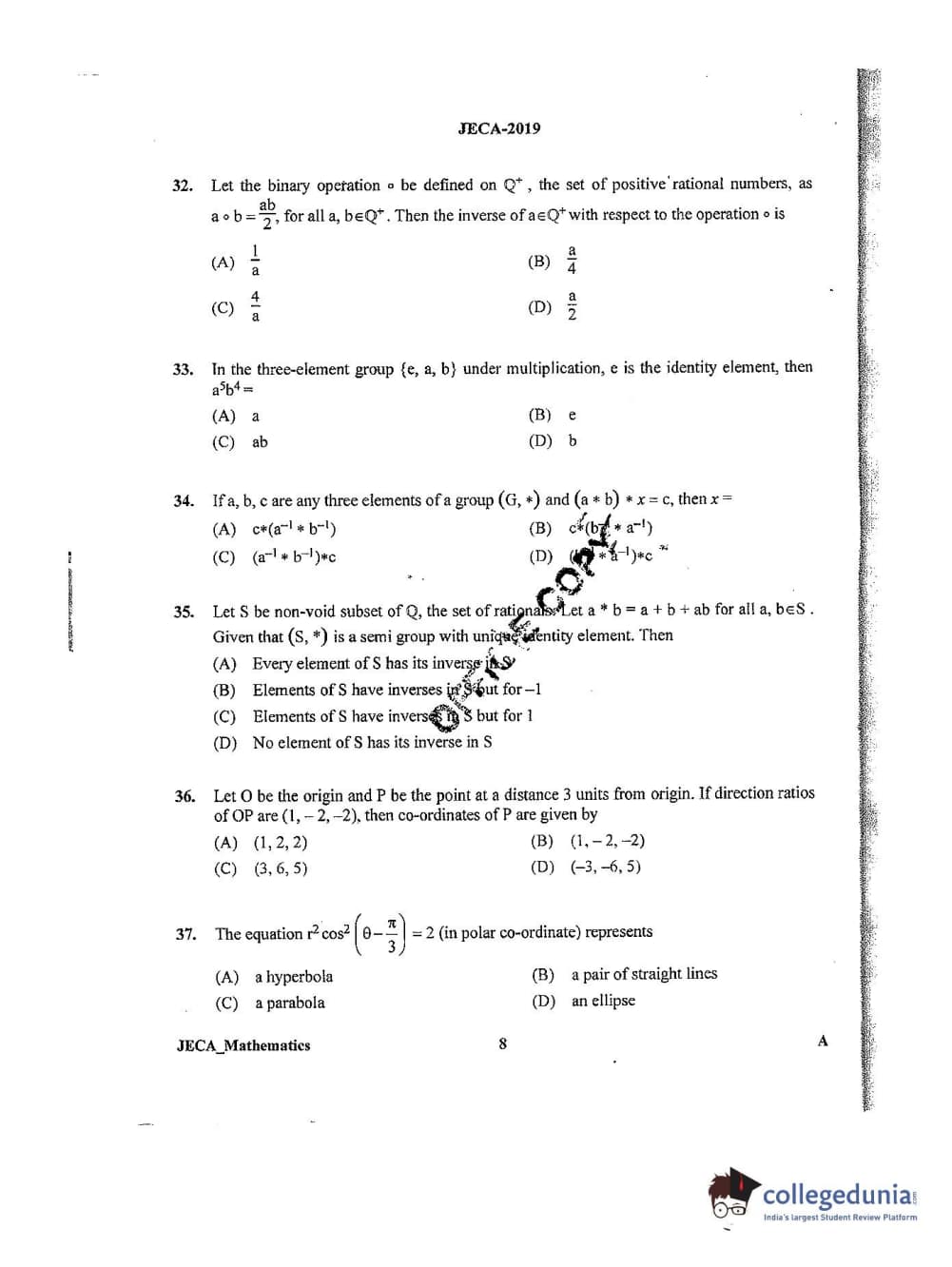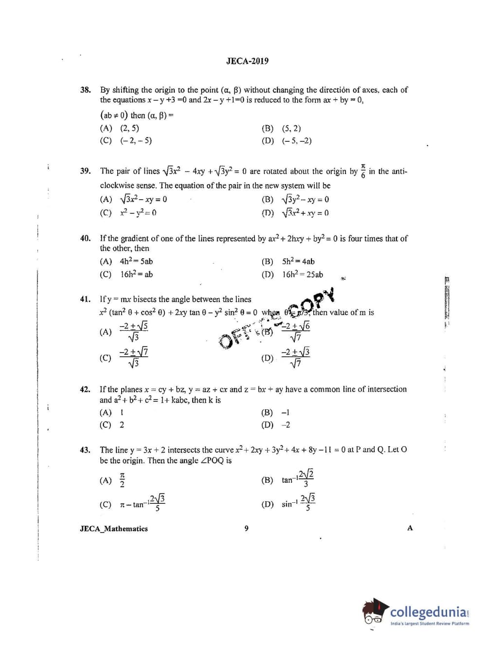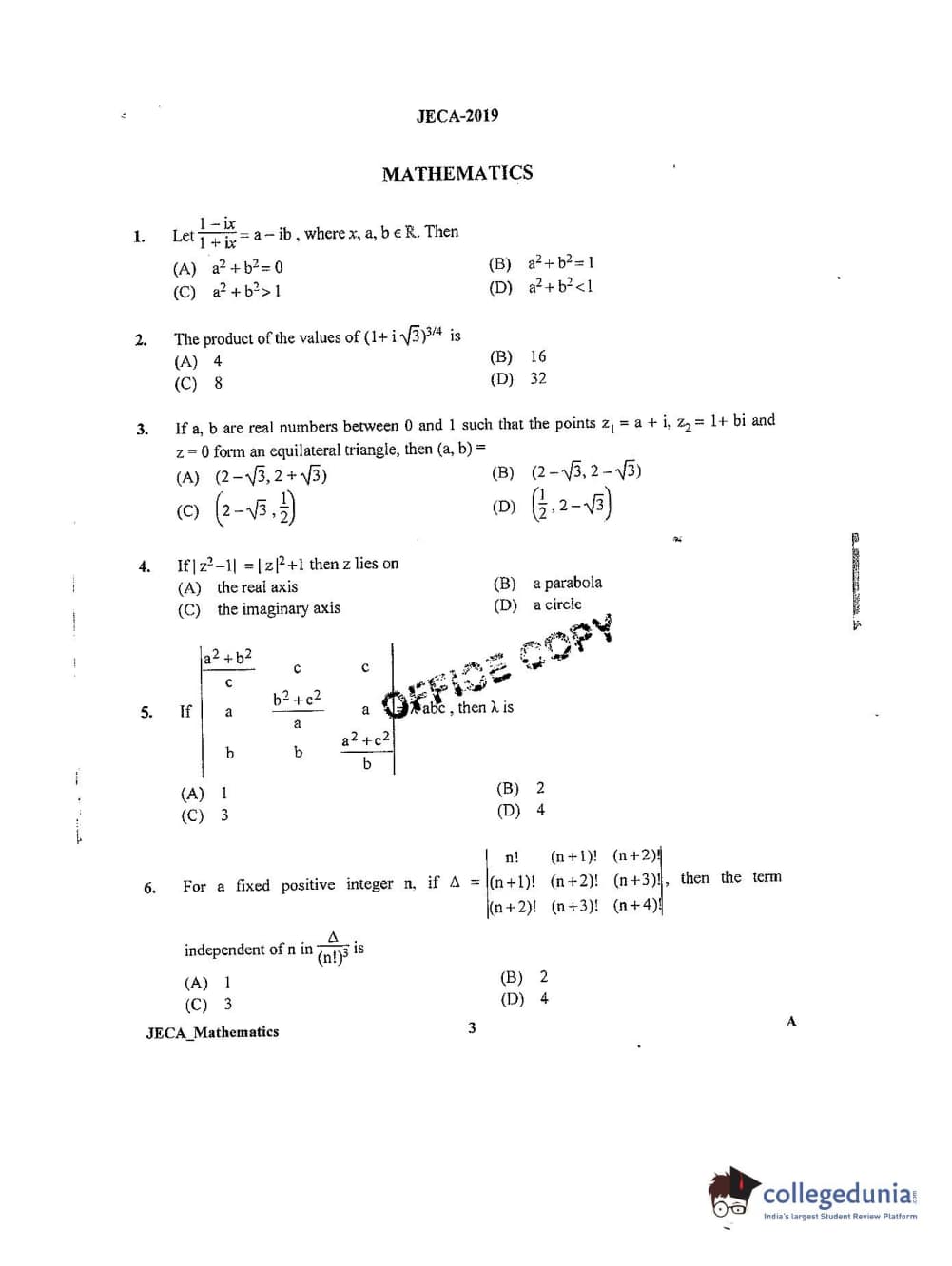 WB JECA 2019 Mathematics Question Paper with Answer Key PDFs