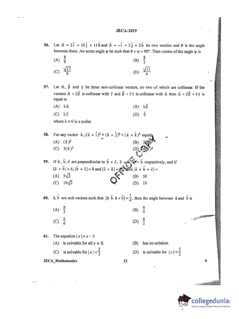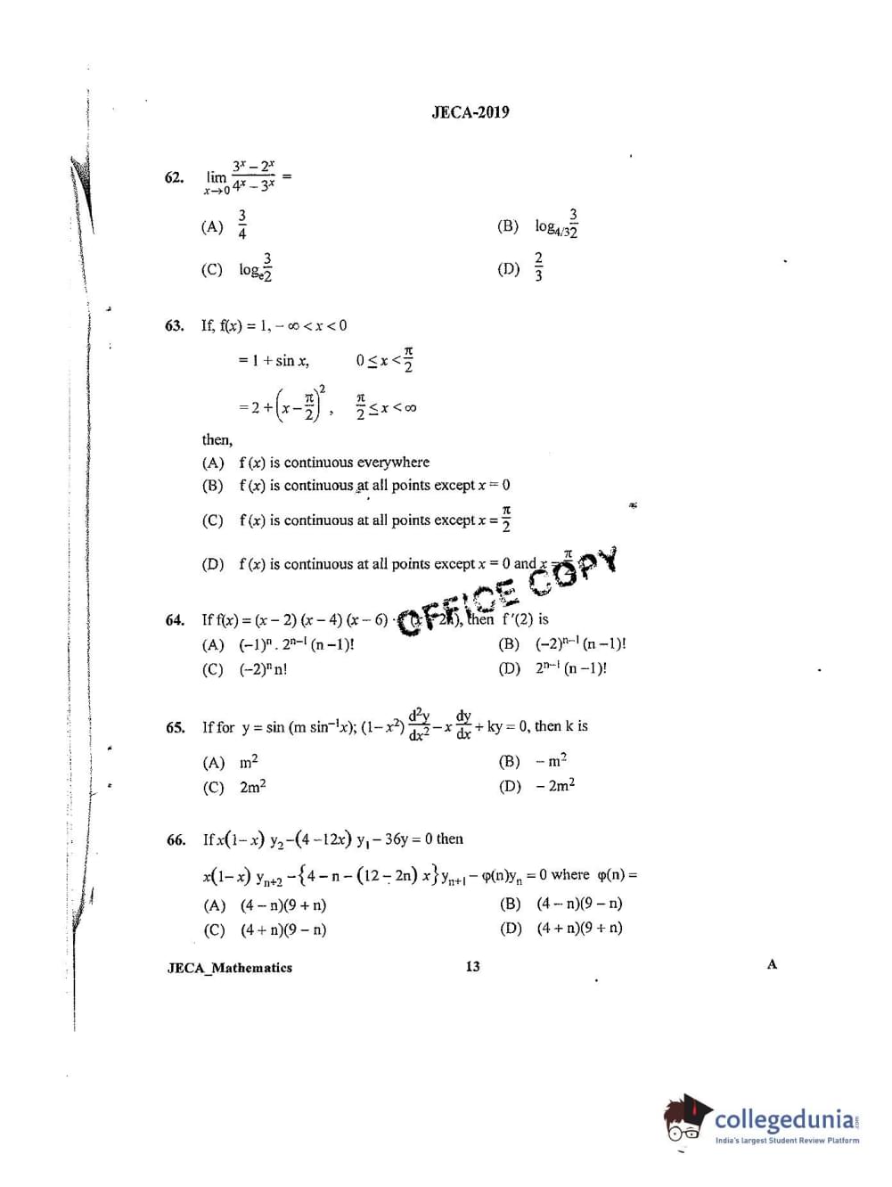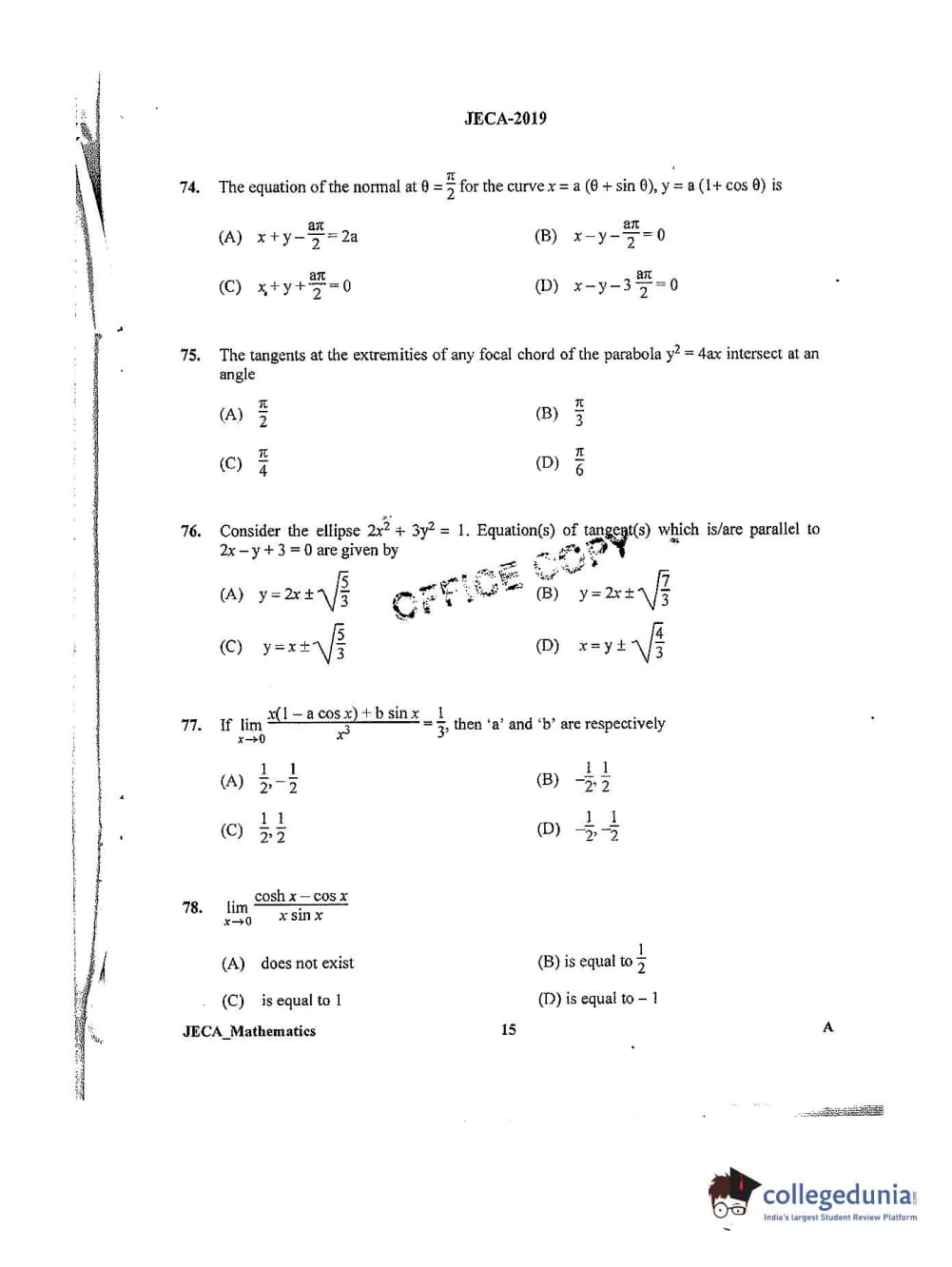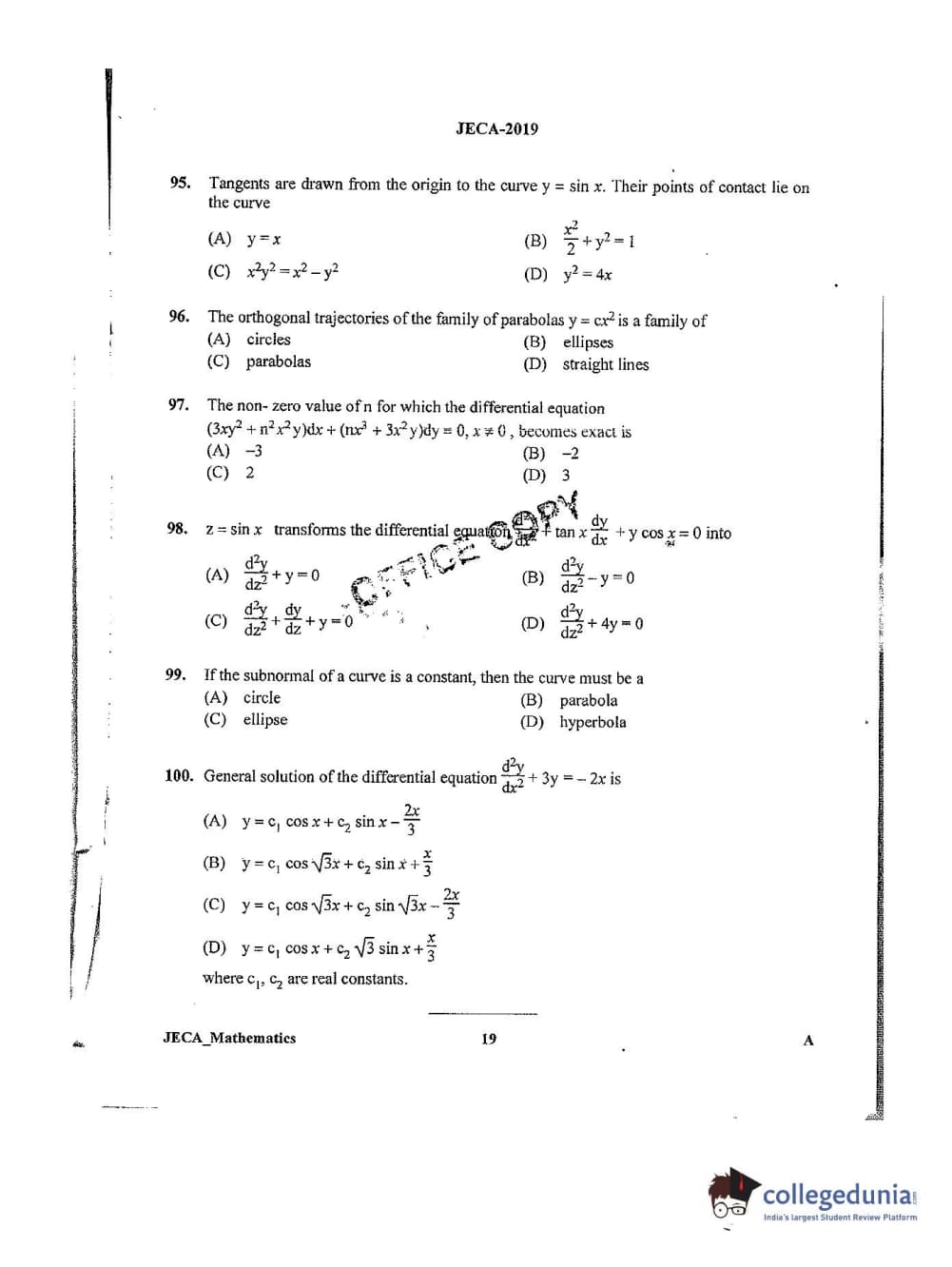 WB JECA 2019 Mathematics Question Paper with Answer Key PDFs