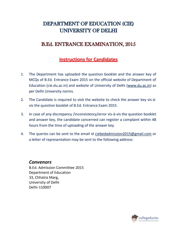 | DU B.Ed Entrance Exam 2015 Question Paper 2015 PDF | DU B.Ed Entrance Exam 2015 Answer Key 2015 PDF |