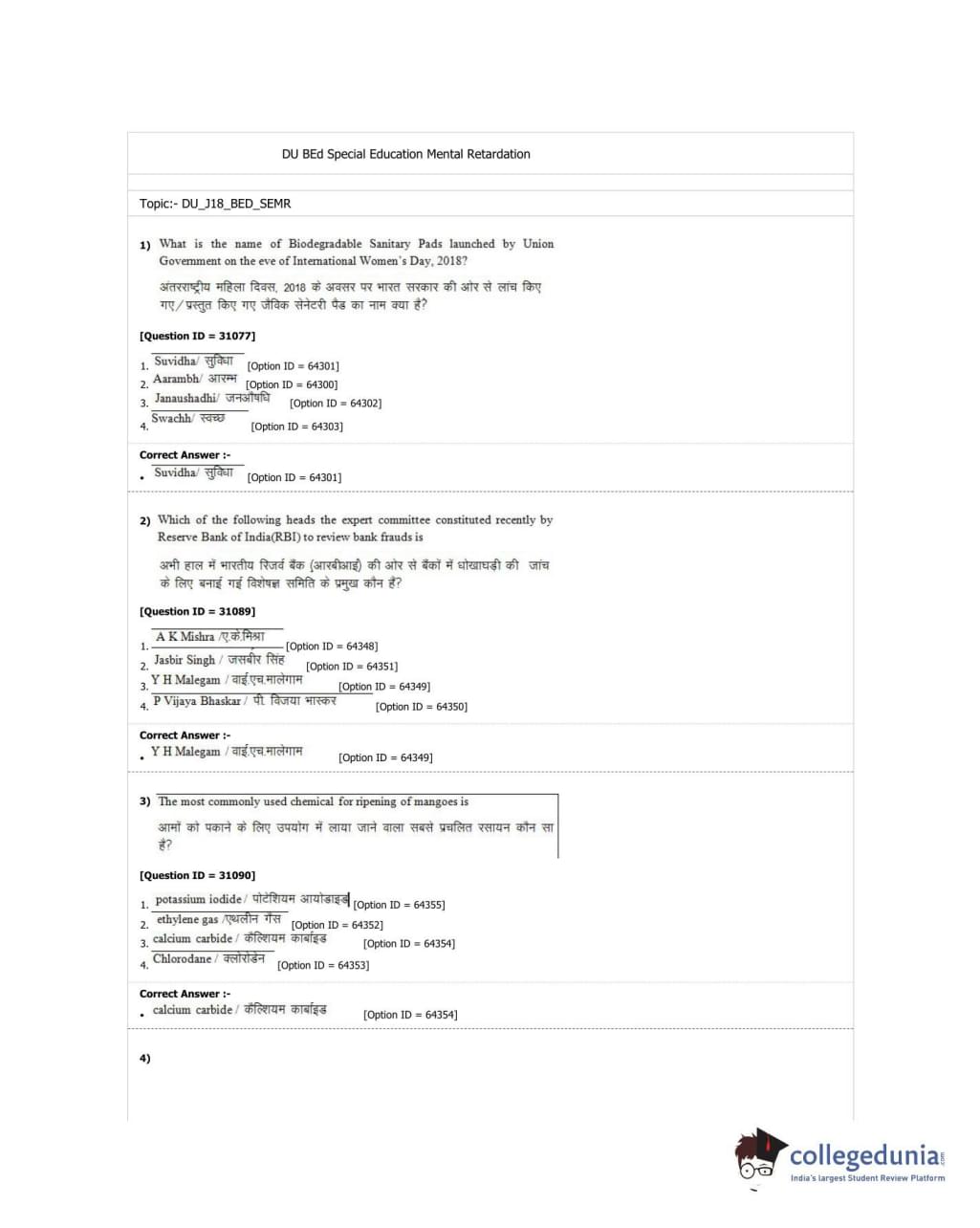 DU B.Ed Entrance Exam 2018 B.Ed. Special Education (Mental Retardation) Question paper with answer key pdf conducted on June 22, 2018 in Shift 2 is available for download. The exam was successfully organized by University of Delhi. The question paper comprised a total of 100 questions.