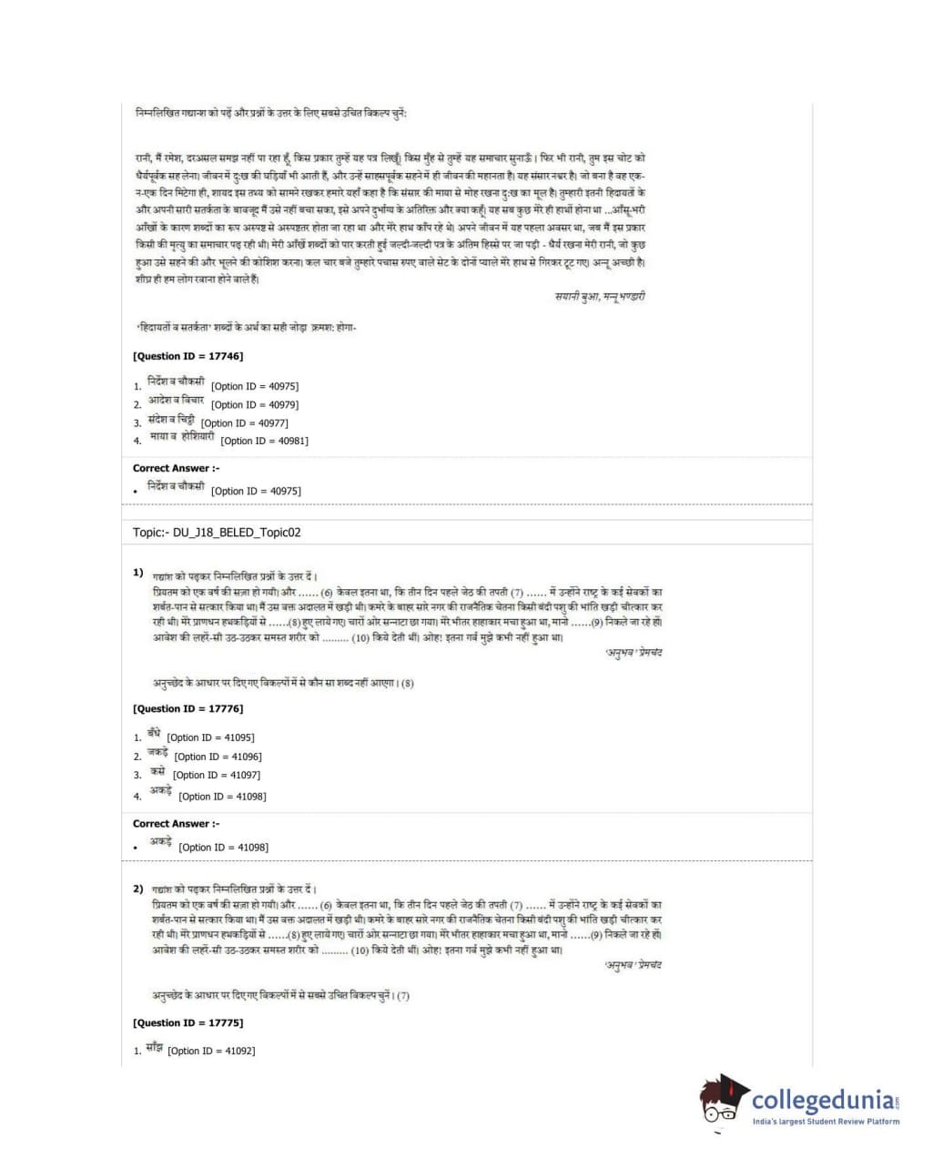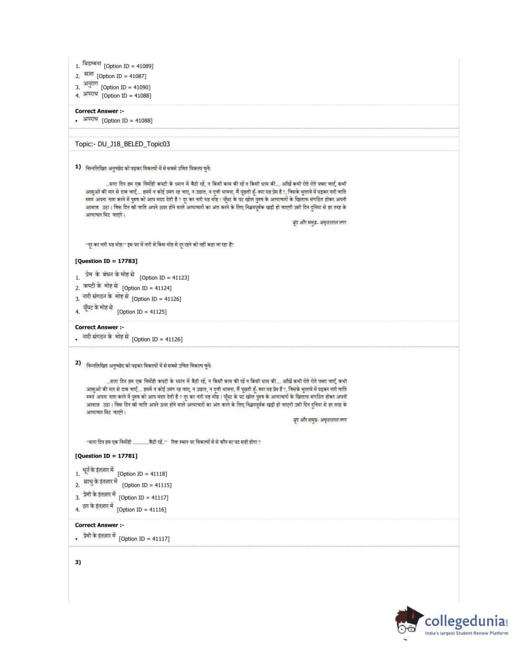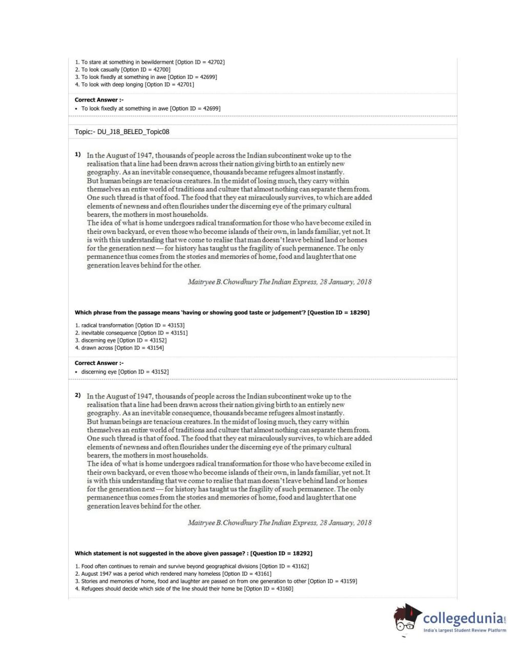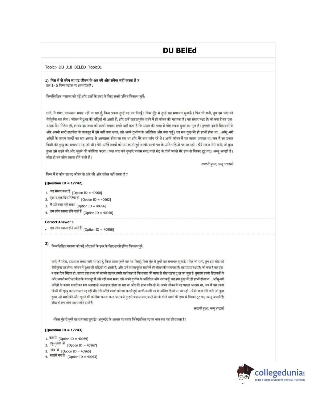 DU B.Ed Entrance Exam 2018 B.El.Ed. Question Paper with Answer Key PDFs Shift 2