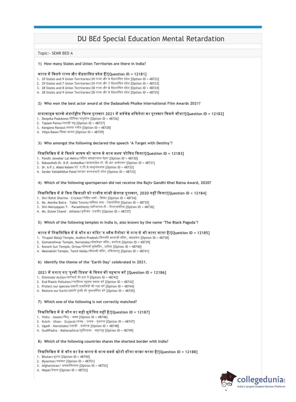 DU B.Ed Entrance Exam 2021 DU BEd Special Education Mental Retardation Question Paper with Answer Key PDF Shift 1