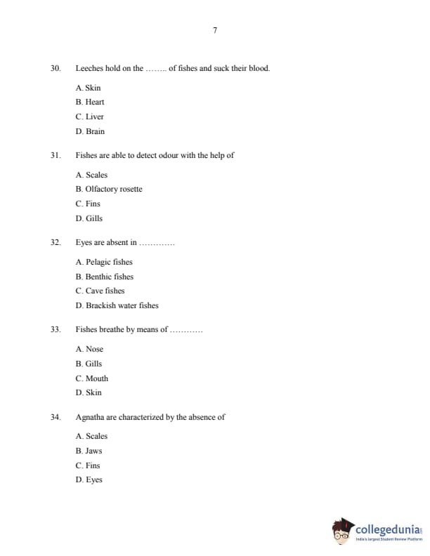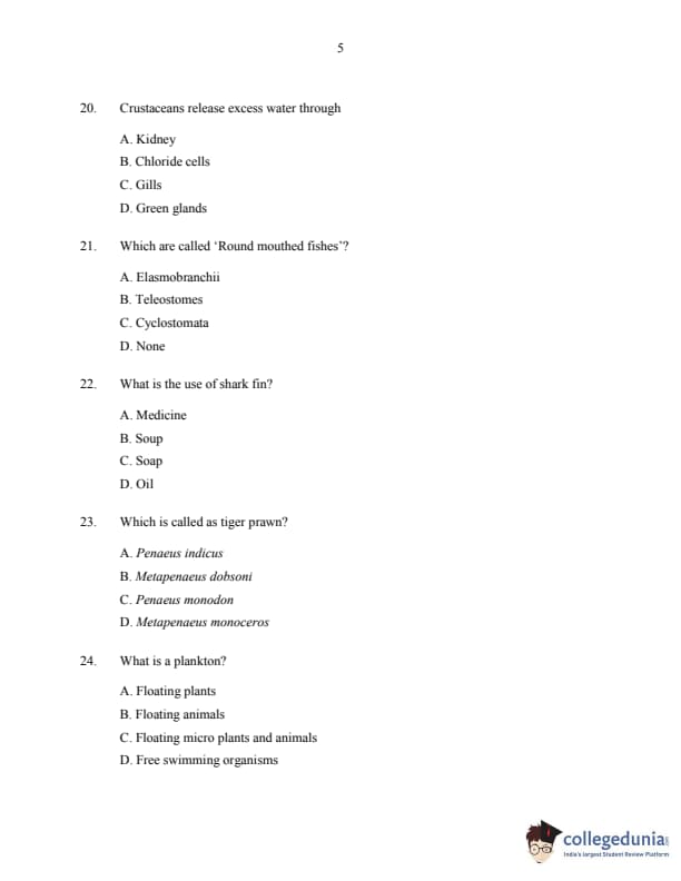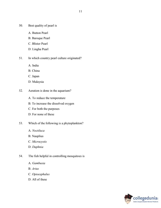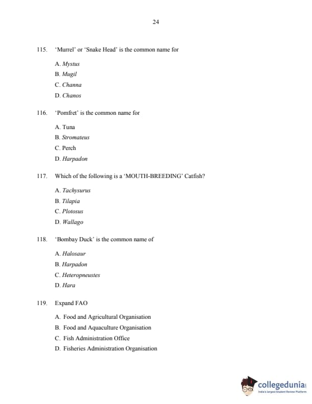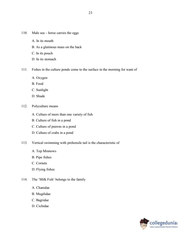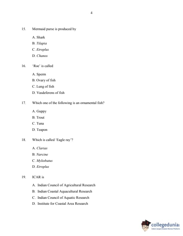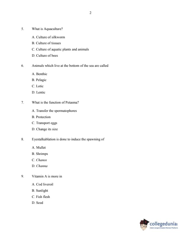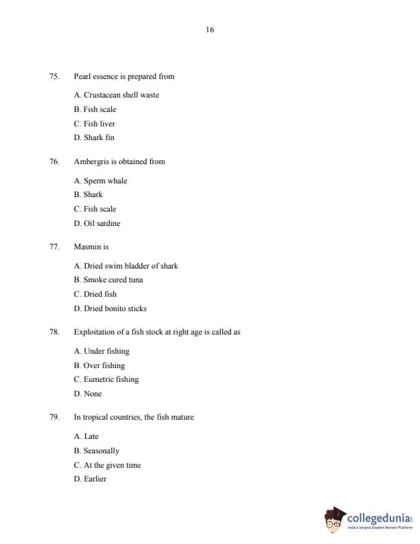 CUSAT CAT 2016 Fisheries Question Paper with Answer Key PDFs
