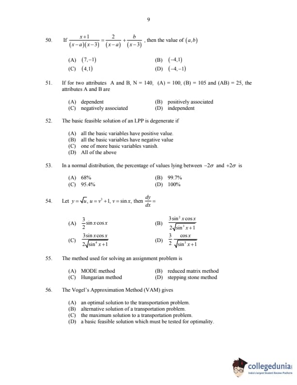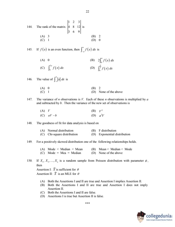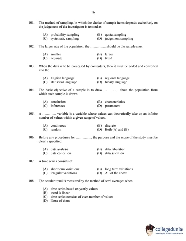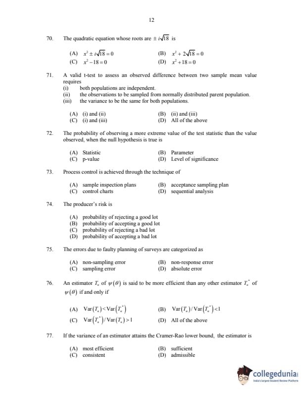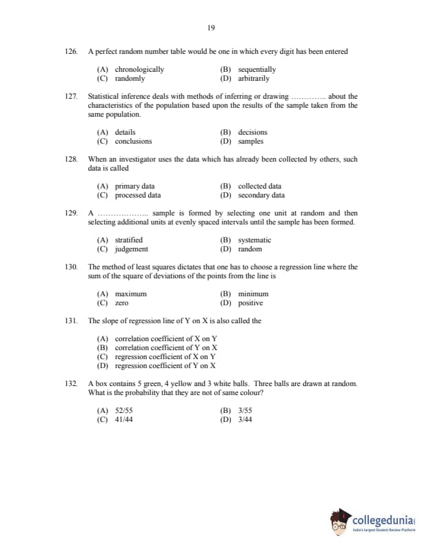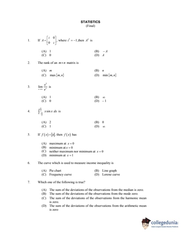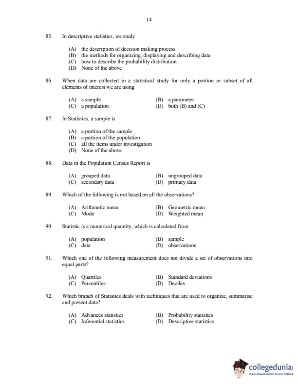 CUSAT CAT 2017 Statistics Question paper with answer key pdf is available for download. The exam was successfully organized by Cochin University of Science & Technology. The question paper comprised a total of 150 questions.