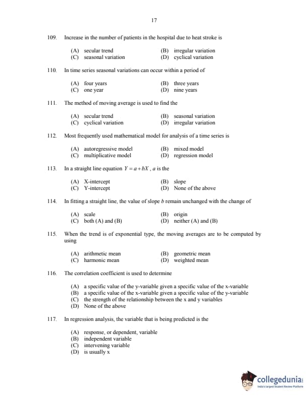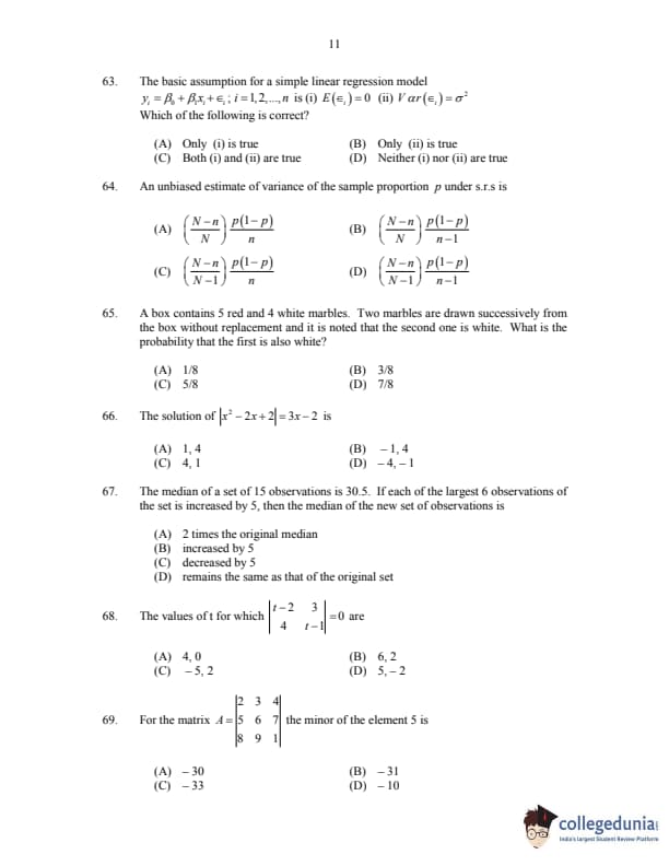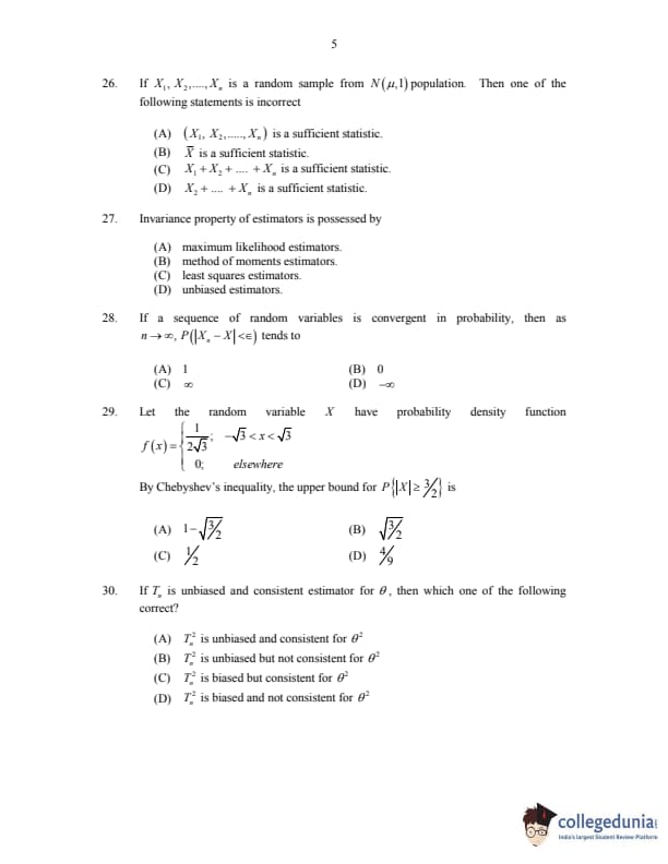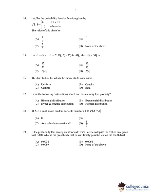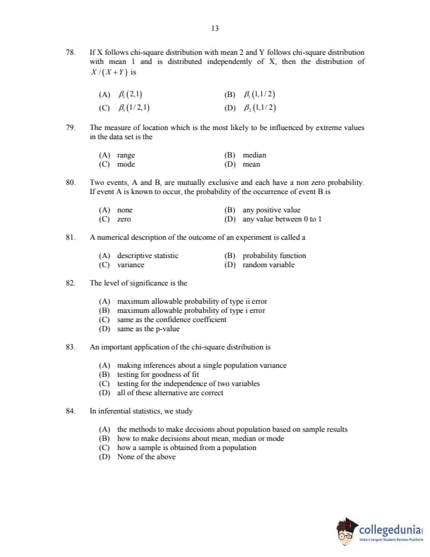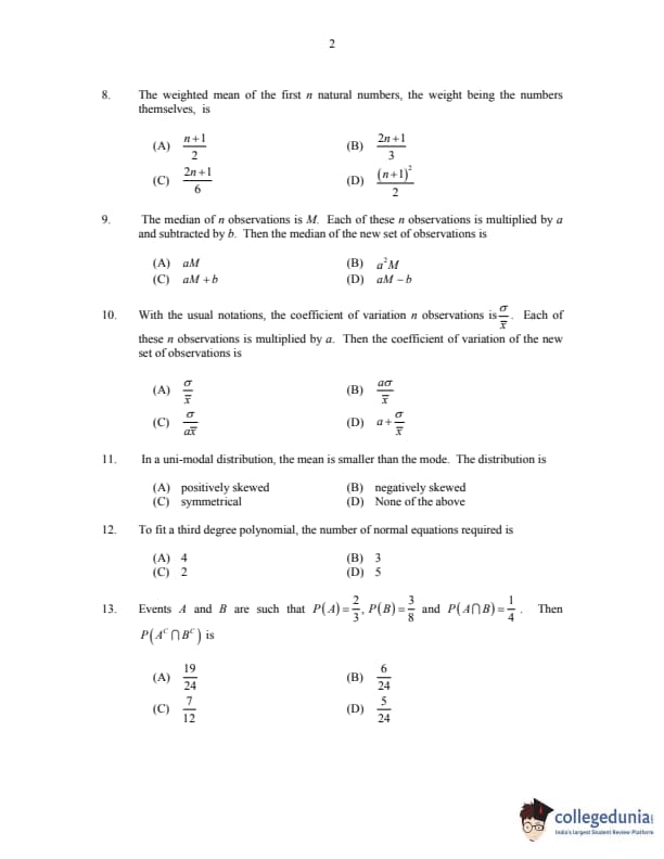 CUSAT CAT 2017 Statistics Question Paper with Answer Key PDFs
