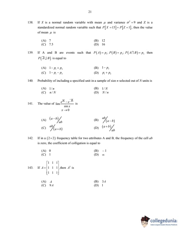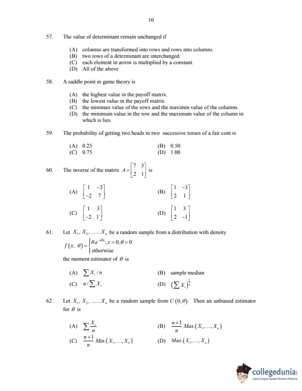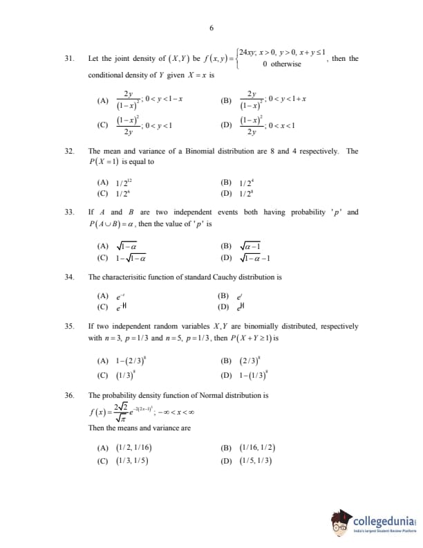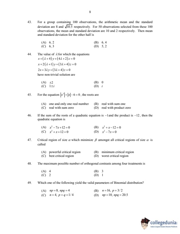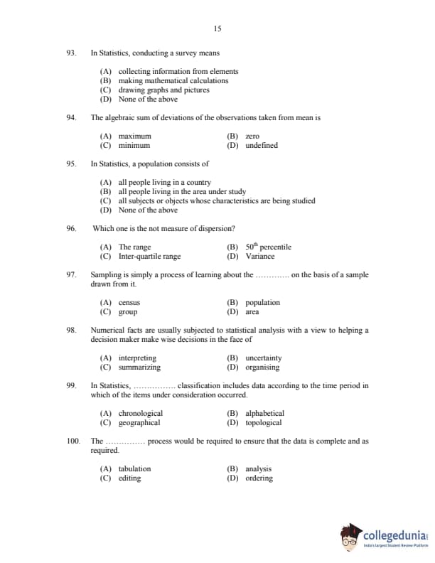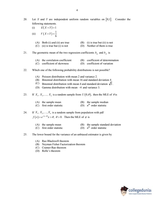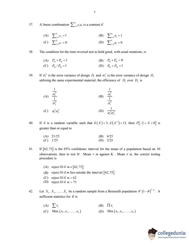 CUSAT CAT 2017 Statistics Question Paper with Answer Key PDFs
