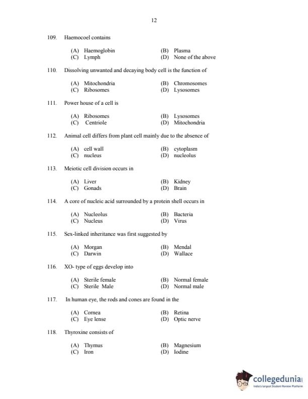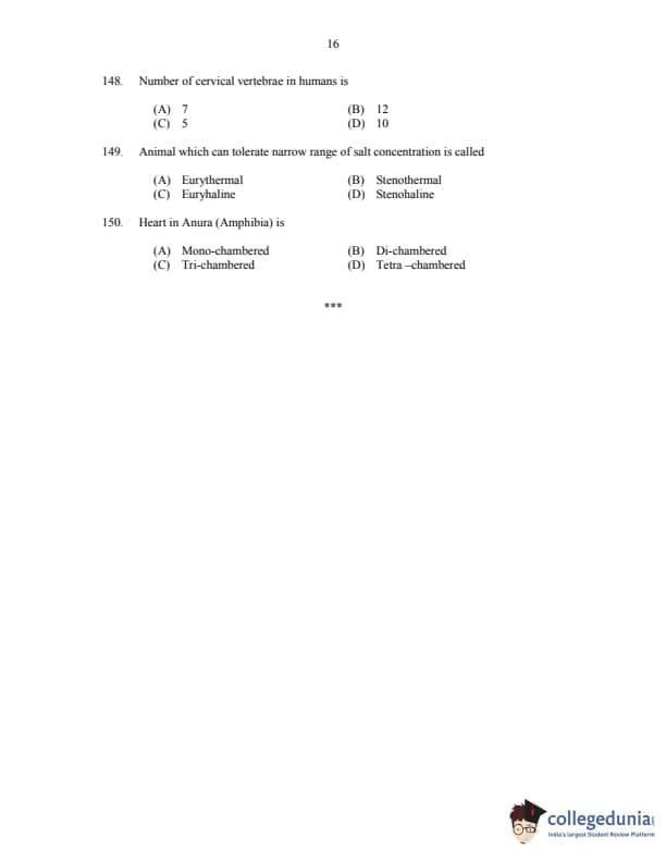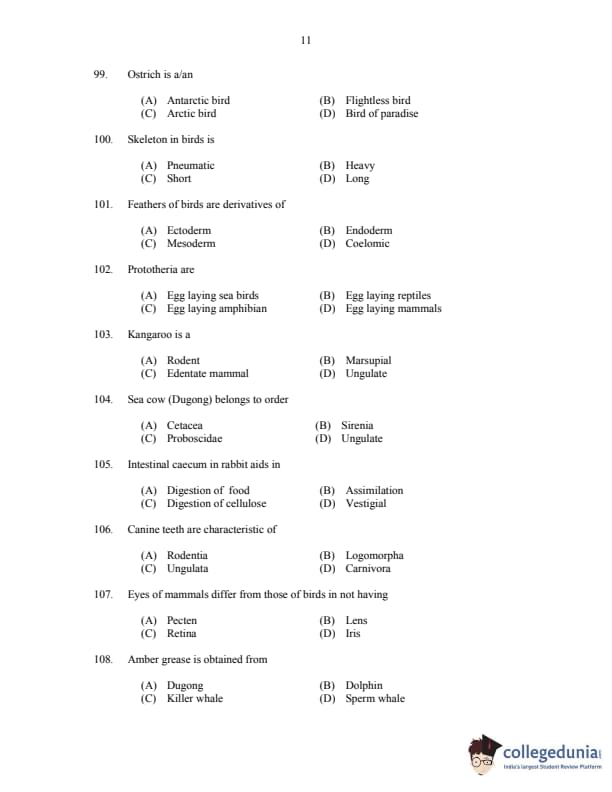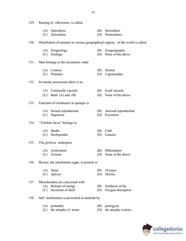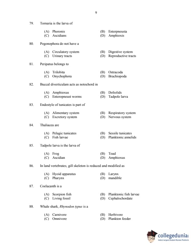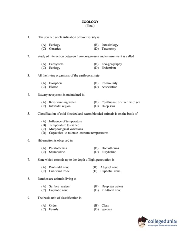 CUSAT CAT 2017 Zoology Question paper with answer key pdf is available for download. The exam was successfully organized by Cochin University of Science & Technology. The question paper comprised a total of 150 questions.