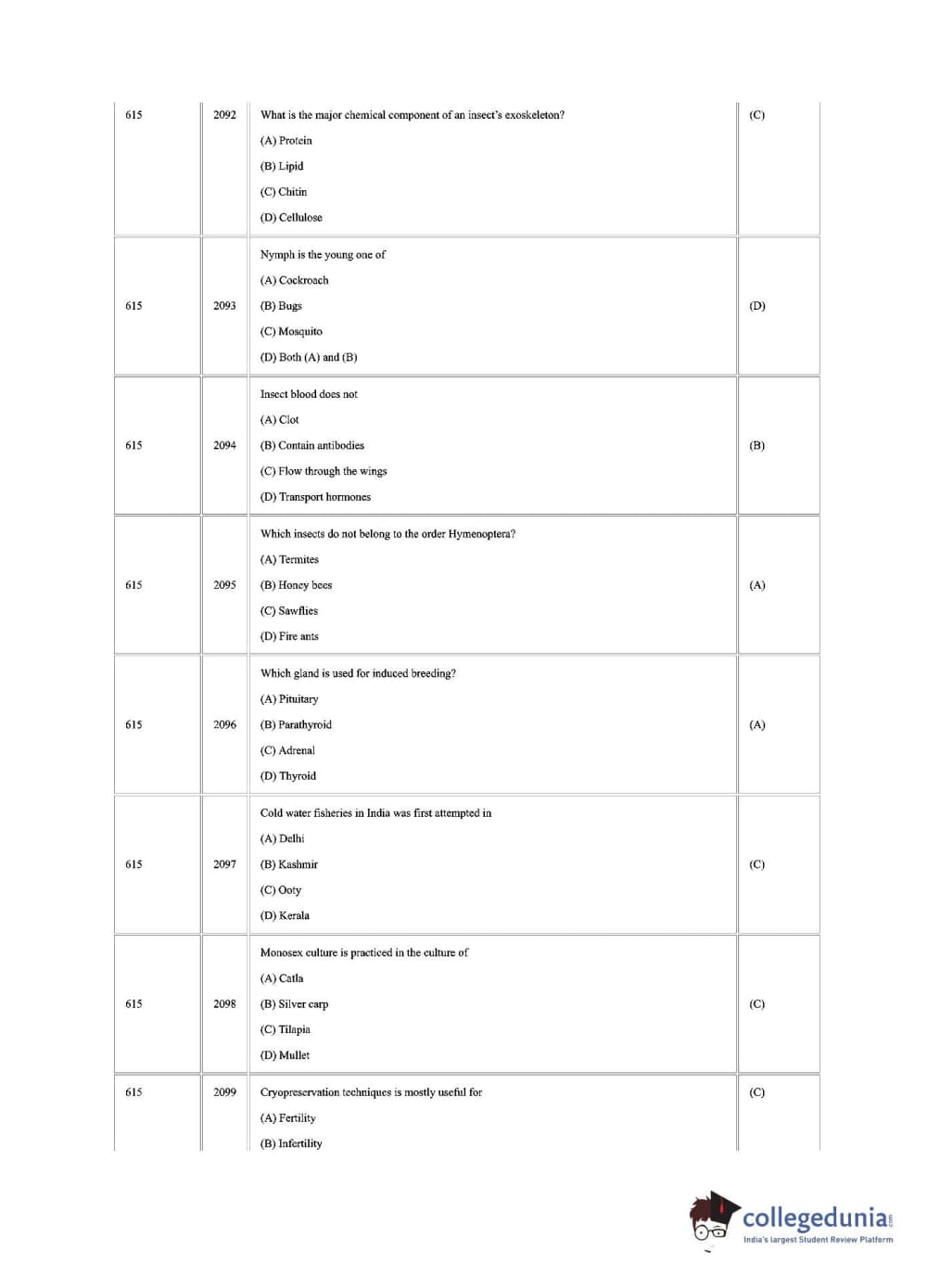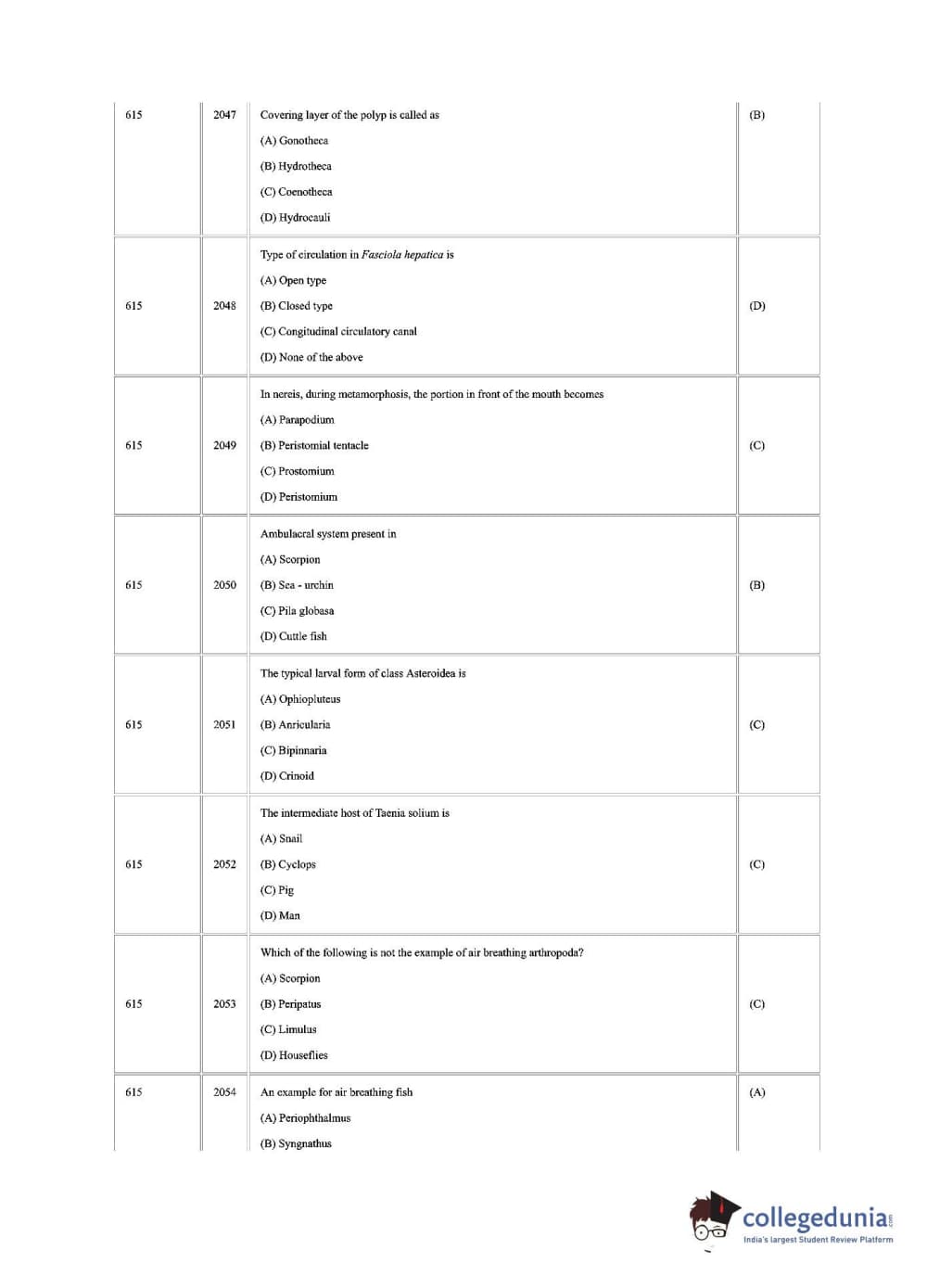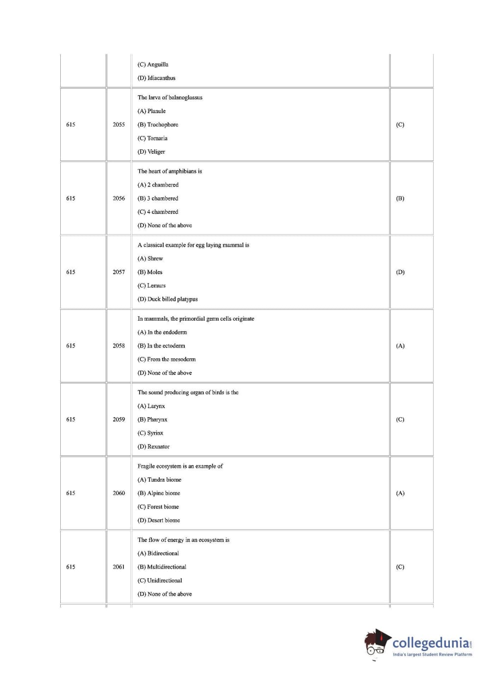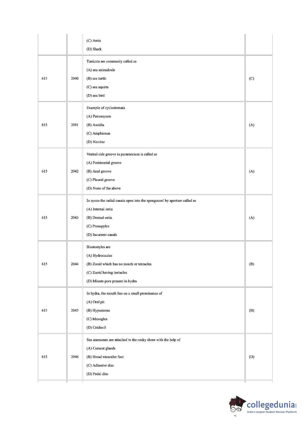 CUSAT CAT 2018 Zoology Question Paper with Answer Key PDFs