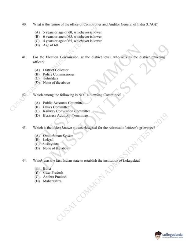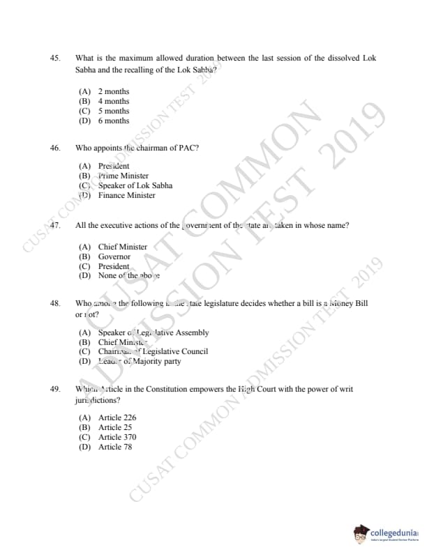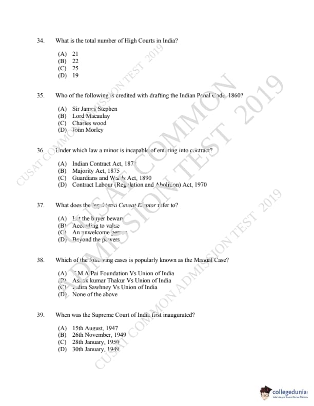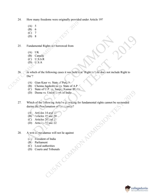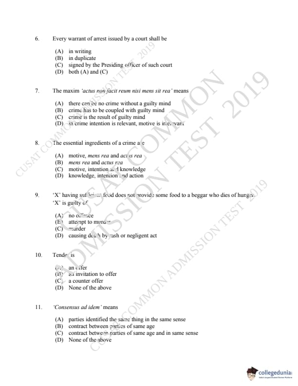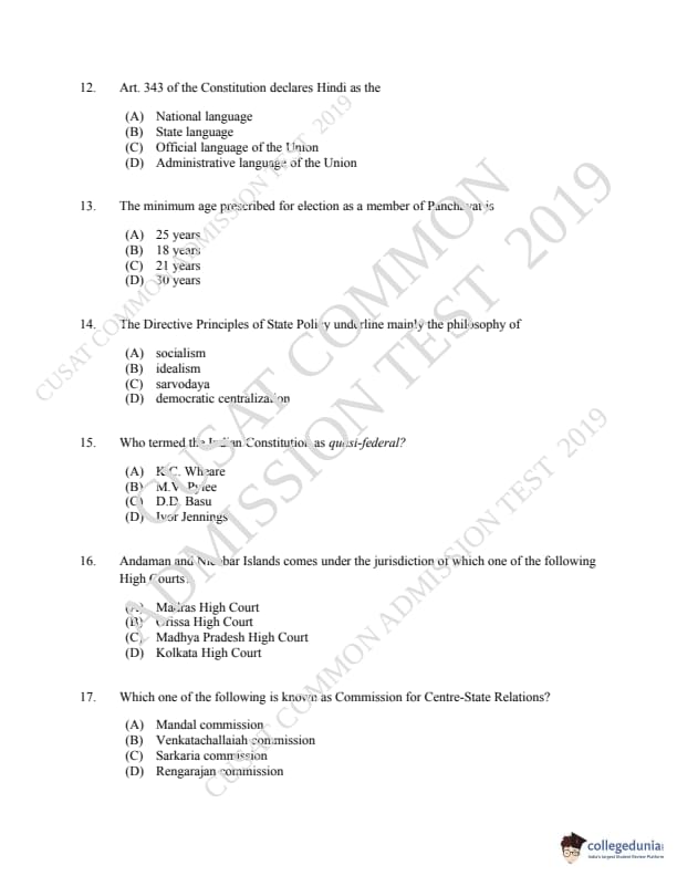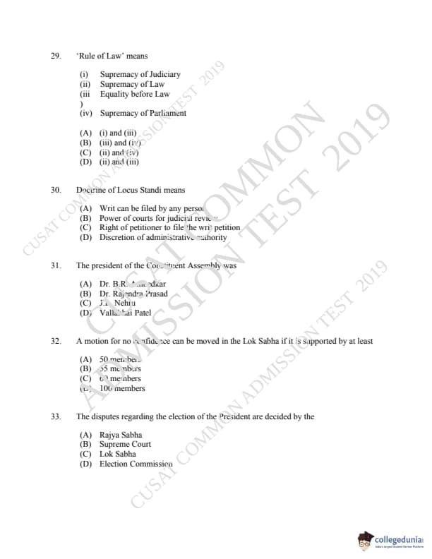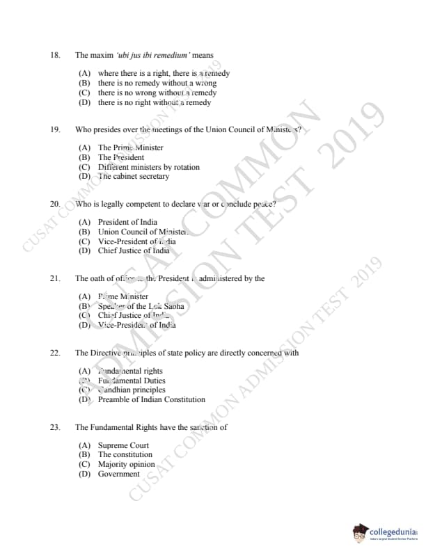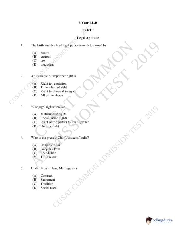 CUSAT CAT 2019 3 Year LLB Question Paper with Answer Key PDFs