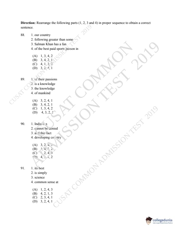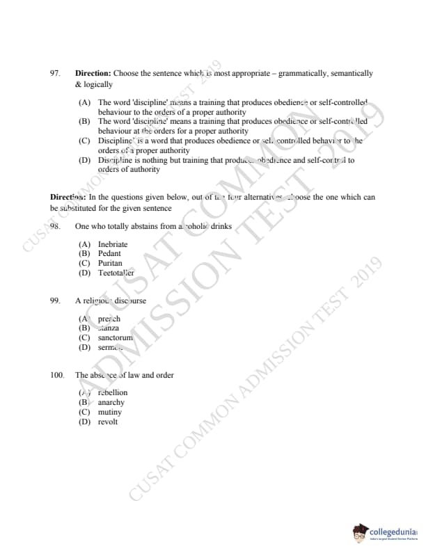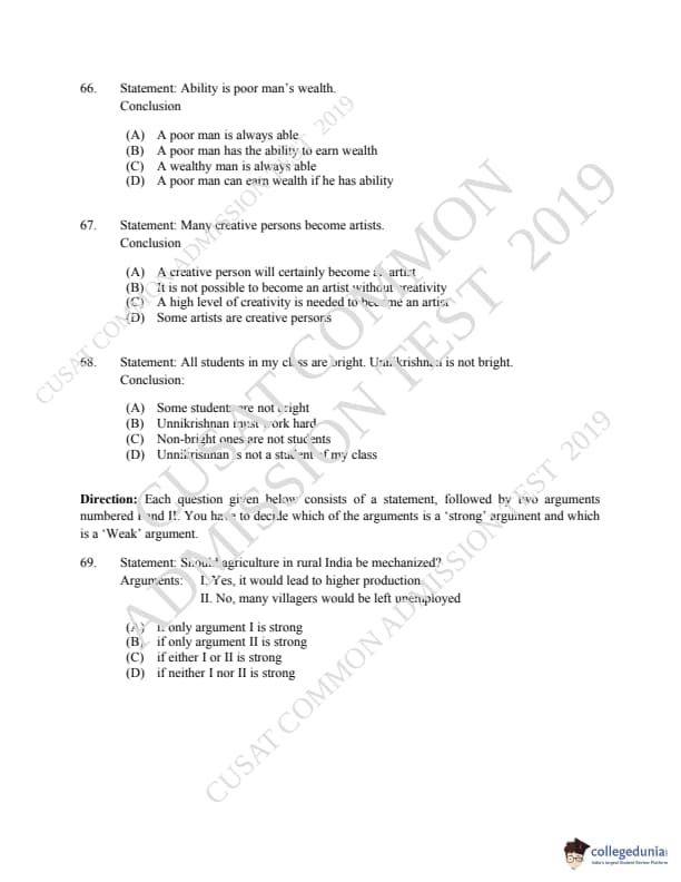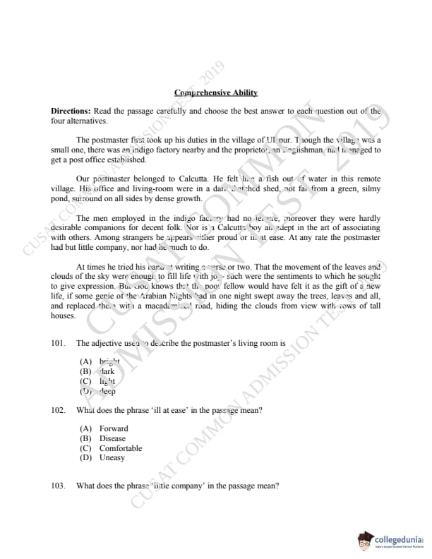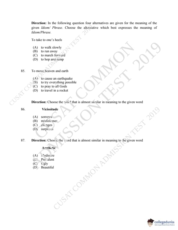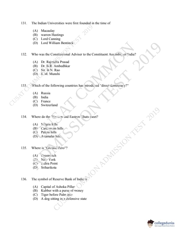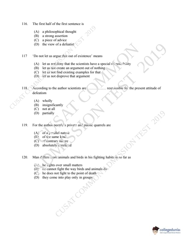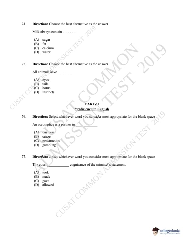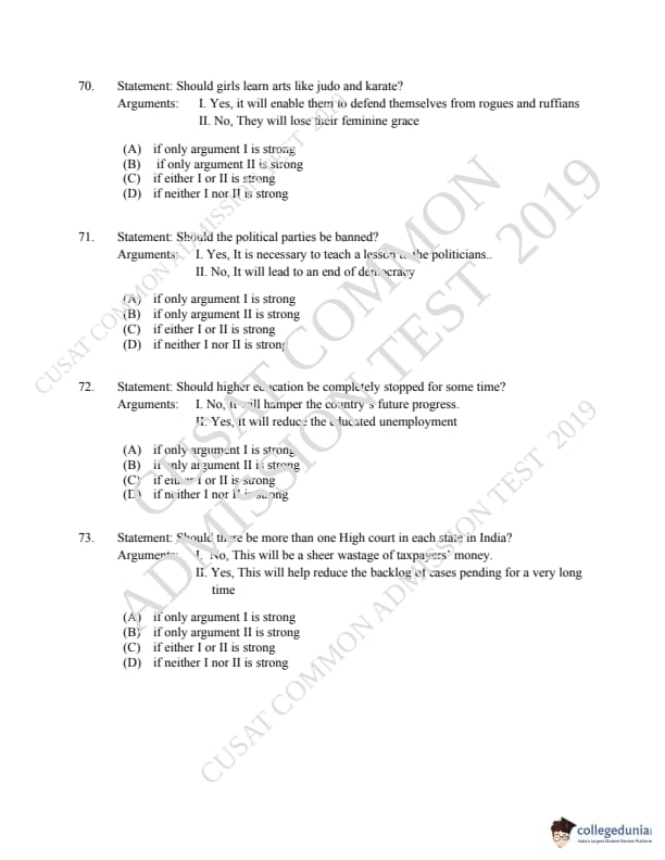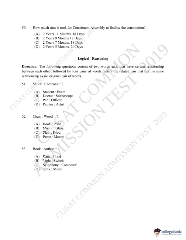 CUSAT CAT 2019 3 Year LLB Question paper with answer key pdf is available for download. The exam was successfully organized by Cochin University of Science & Technology. The question paper comprised a total of 150 questions.