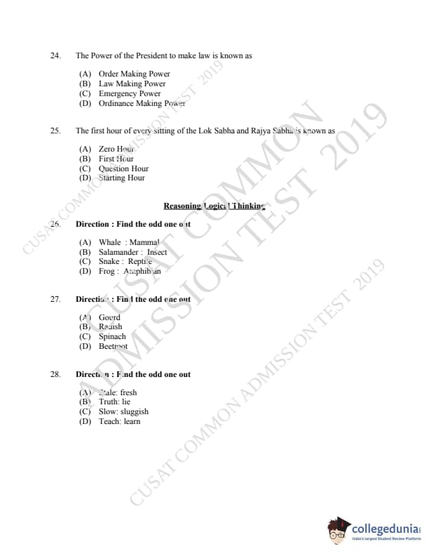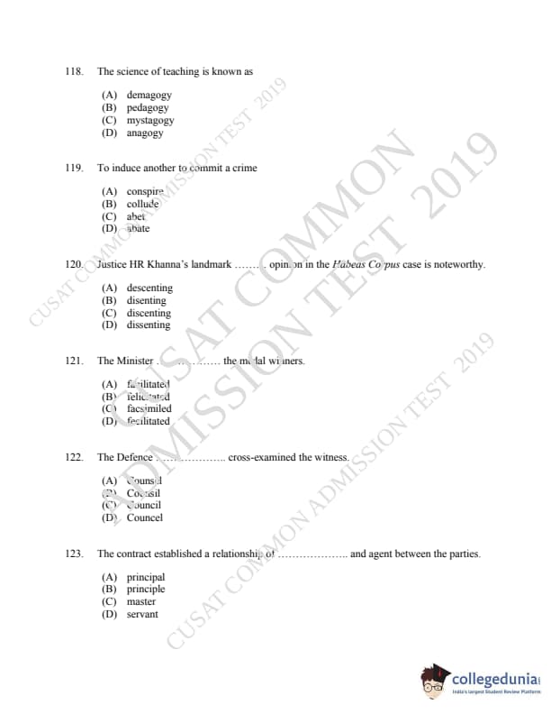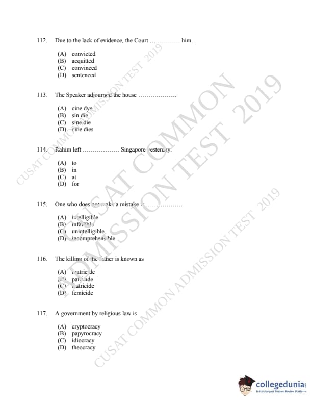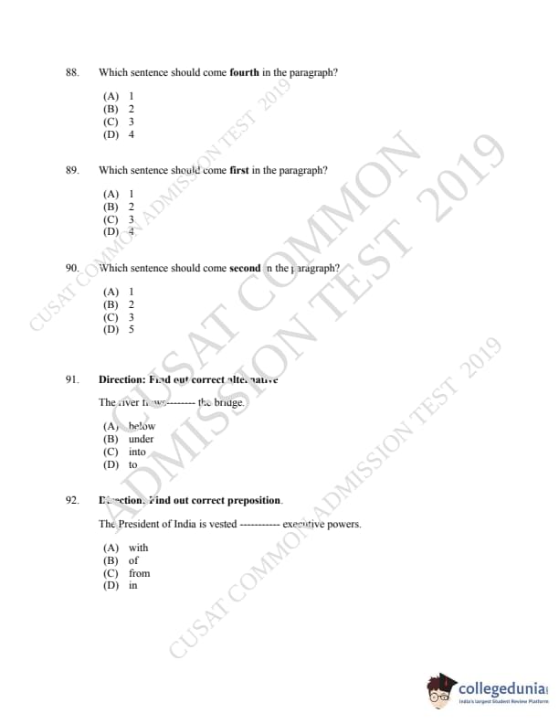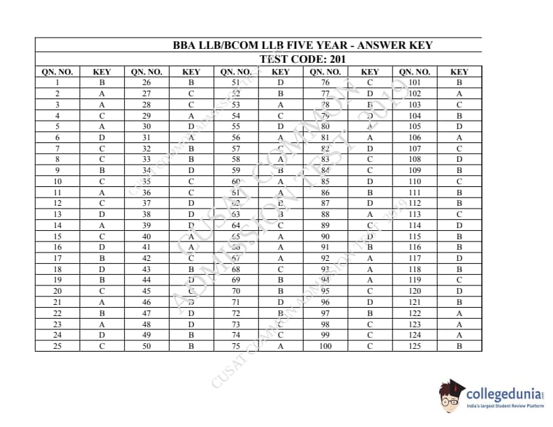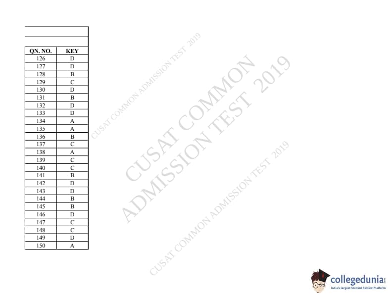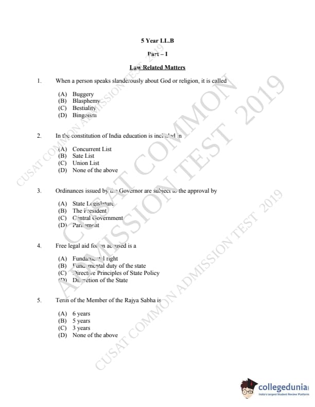 | CUSAT CAT 2019 5 Year LLB Question Paper PDF | CUSAT CAT 2019 5 Year LLB Answer Key PDF |